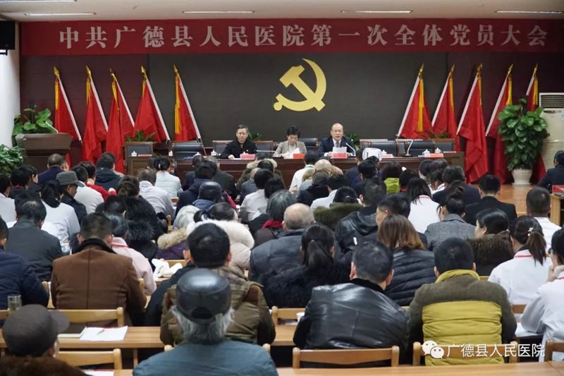 12月29日下午,广德县人民医院门诊四楼会议室喜庆庄严,气氛热烈,主席台帷幕中央党徽高悬,鲜艳的红旗分列两侧,中共广德县人民医院第一次全体党员大会隆重举行。 县卫计委党委书记、主任邱秀敏,党委委员、副主任
