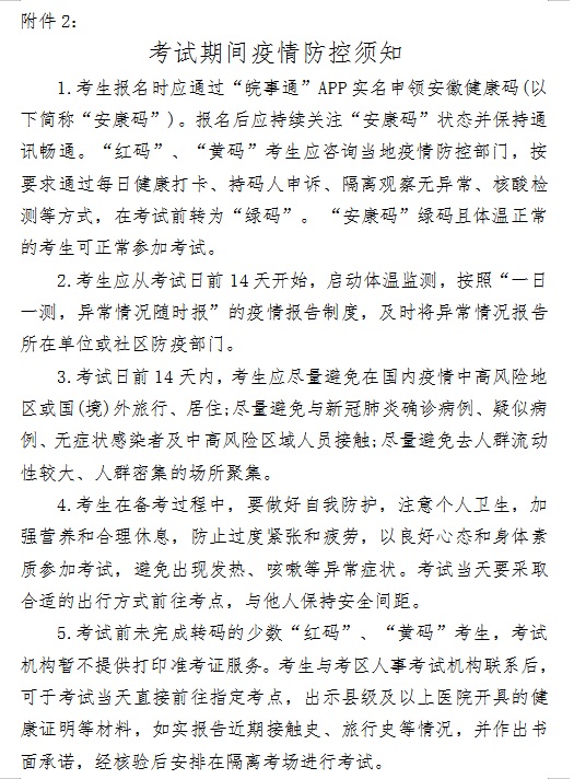 报考人员报名前,应通过“皖事通”APP实名申领“安康码”。报考人员报考前请认真阅读《考试期间疫情防控须知》(附件2)。报考人员提供的信息必须与本人实际情况、报考条件和所报考的岗位要求相一致。凡弄虚作假通过资格审查,其实际情况与报考条件规定不符的,一经查实,即取消考试、聘用等资格。