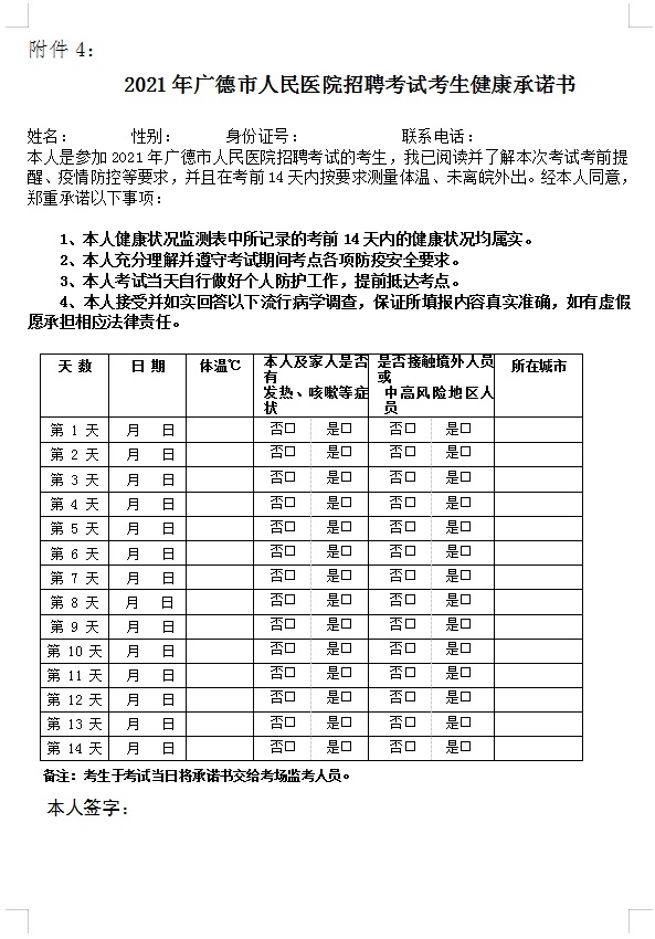 报考人员报名后,须在2021年11月10日前往广德市人民医院人事科领取准考证。根据疫情防控要求,参考资格审查人员需持健康码,测体温。省外考生和高中风险地区来广人员均要持有72小时内核酸检测阴性证明,或提前一天到市人民医院进行核酸检测。
