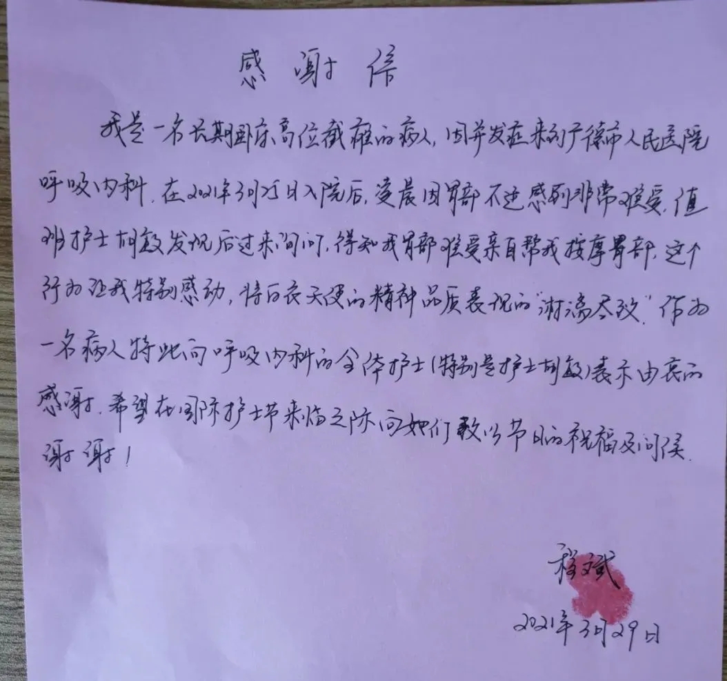 2021年3月29日,广德市人民医院呼吸与危重症医学科收到了一份患者手写的感谢信。