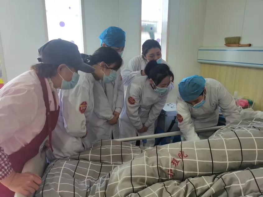 伤口造口专科护士张倩,带领小组成员为长期卧床老人的皮肤进行仔细检查。