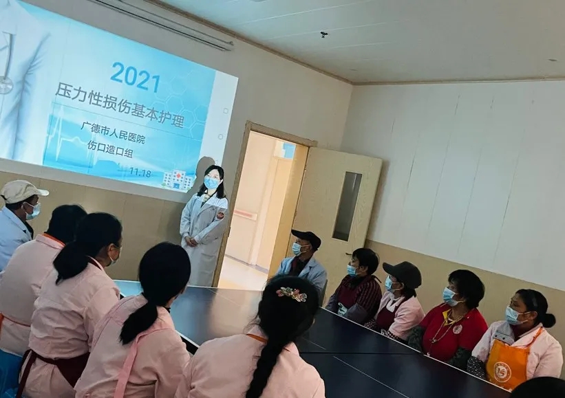 伤口造口组成员杨欢,为养老院的护理员们开展“压力性损伤基本护理”知识讲座。