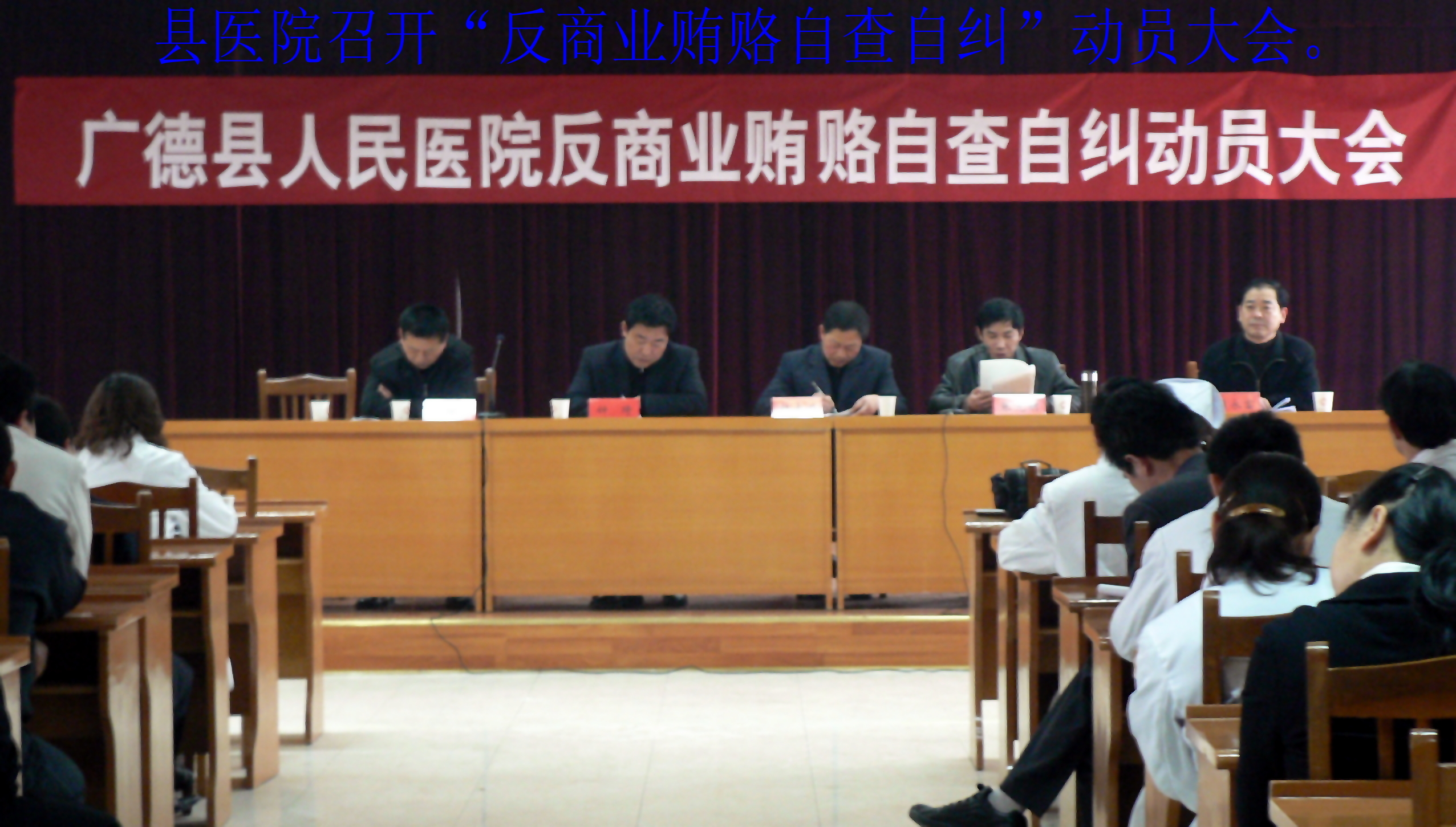 2006年4月14日下午,为了净化医疗市场,规范医疗行业行为,认真贯彻落实卫生部关于全国卫生系统治理医药购销领域商业贿赂专项工作电视电话会议神,县医院召开了“反商业贿赂自查自纠动员大会”。会上,县医院党总支书记、院长张先明作了“关于广德县医院开展‘反商业贿赂自查自纠’工作的动员报告”,报告中阐述了医药行业商业贿赂的危害性,并对全院医务人员提出了要深入开展学习胡锦涛总书记关于“八荣八耻”重要论述的精神实质,大力开展社会主义荣辱观的实践活动,突出“以服务人民为荣,以背离人民为耻;以遵纪守法为荣,以违法乱纪为耻”的工作要求。会后,县医院领导与各科室负责人签定了“行风目标管理责任书”。县检察院领导、县卫生局领导出席了会议并作讲话。