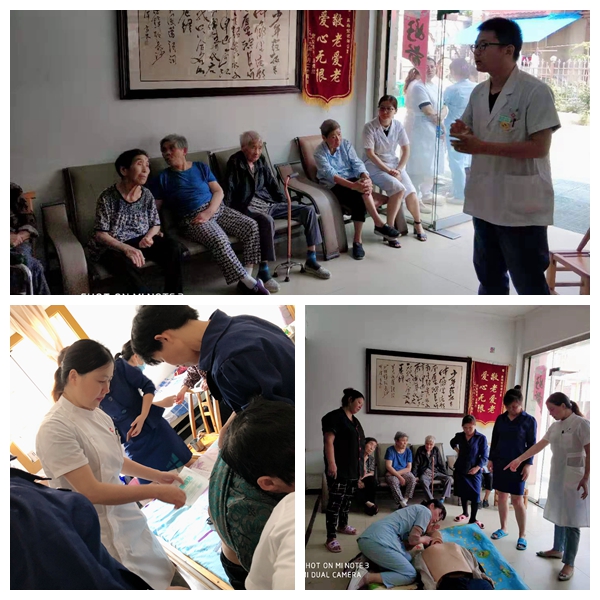 急诊科钟伟医生为养老院护理人员讲解了心肺复苏知识,护理部主任杨正霞讲解了褥疮伤口的护理,急诊科护士长喻红向大家现场进行了心肺复苏、人工呼吸等急救演示,确保住在养老中心里的老年人能够得到及时有效的医疗救治,健康幸福地安享晚年。