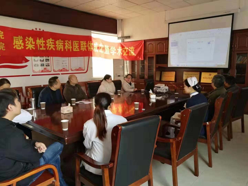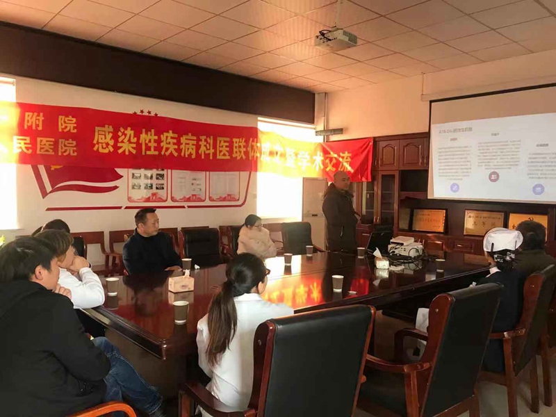 参观后,杨江华主任一行与感染科工作组共同来到会议室进行学术交流。会上:首先双方汇报了科室现有硬件设备和人员配备;接着杨主任工作组就食管胃底静脉曲张消化道出血及结核药物性损害进行病例汇报,我院感染科工作组就艾滋病及皮疹待查进行病例汇报,双方就疑难病例进行了共同探讨;最后杨主任根据我院感染科现有条件提出了新技术的展望及对在感染科工作的同仁就自身防护措施方面提出了建议性意见。