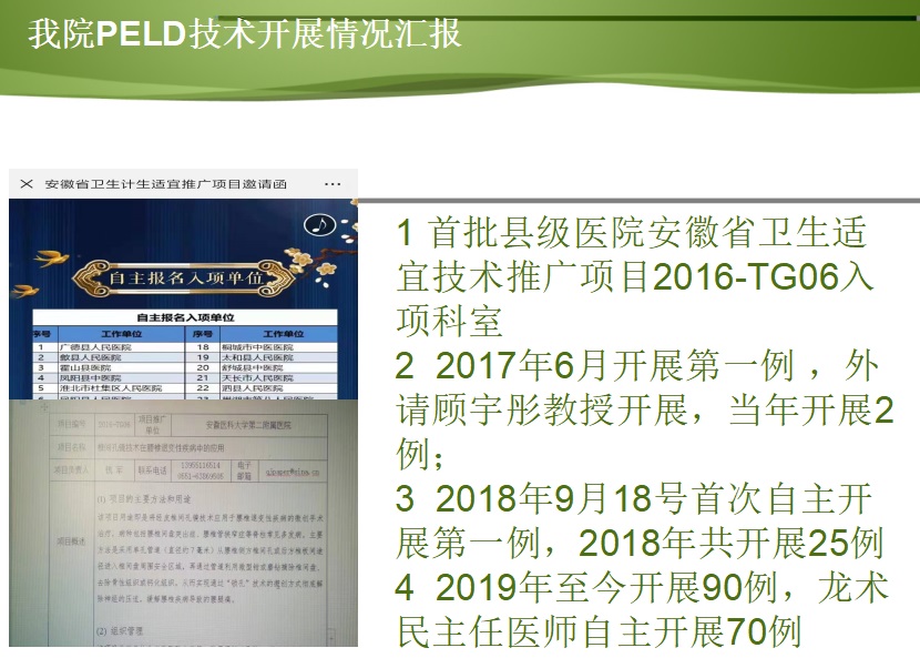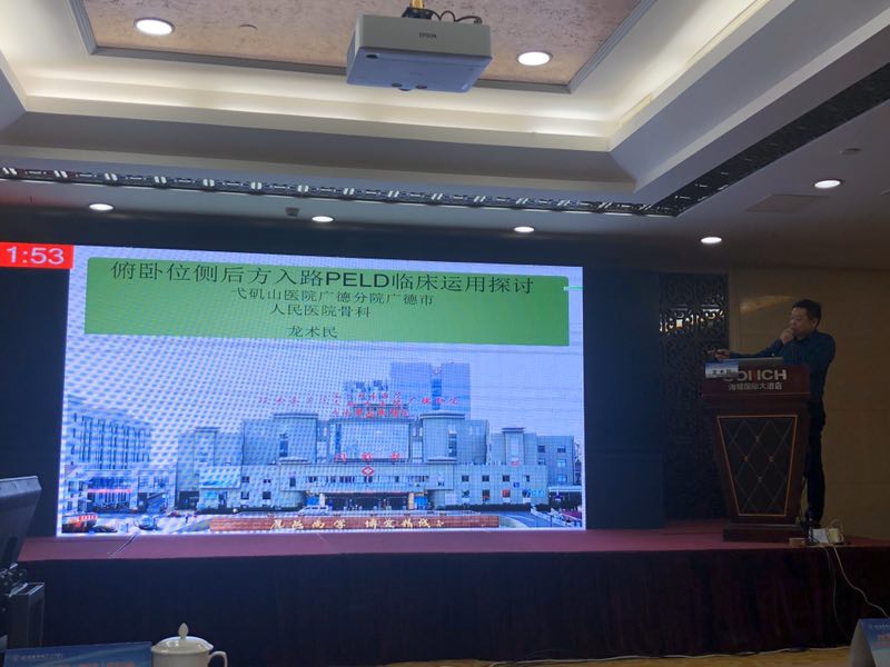 下图是我院骨科龙术民主任医师在第一届皖南片骨科联盟上就“俯卧位侧方后入路PELD临床应用探讨”的汇报演讲,获得了省内外专家的一致好评。