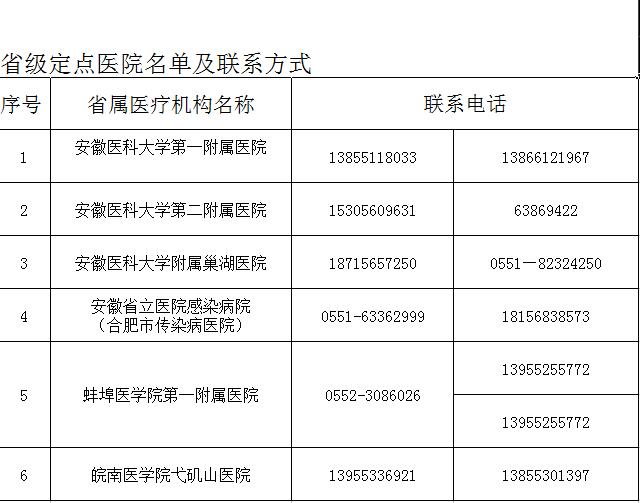 安徽省新型冠状病毒感染的肺炎医疗救治省级定点医院名单及联系方式