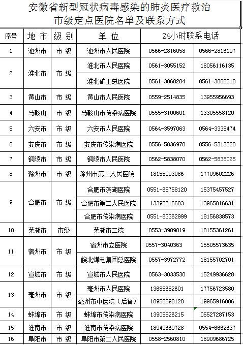 安徽省新型冠状病毒感染的肺炎医疗救治市级定点医院名单及联系方式