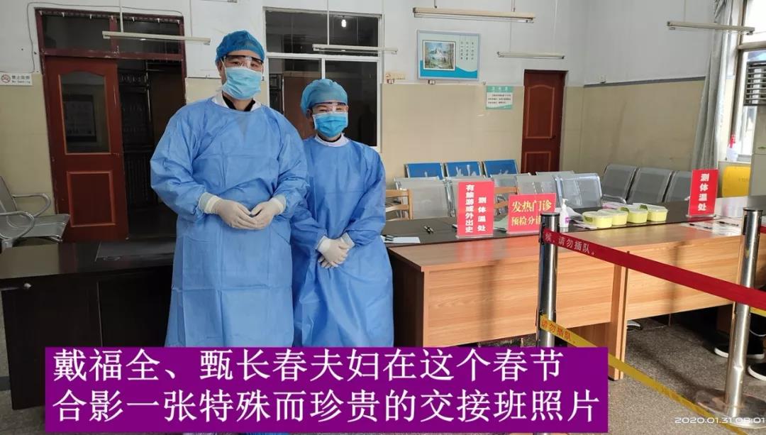 1月31日上午8点,前来普通发热门诊上白班的戴福全主任和刚从发热预检分诊下夜班的妻子甄长春在这个特殊的地点合影留念。“这是个特殊的新年,也是个特殊的时期,我们想把这张照片给孩子们看,让他们知道爸爸妈妈都是合格的医务工作者,都在为保护人民的生命健康全力奉献!