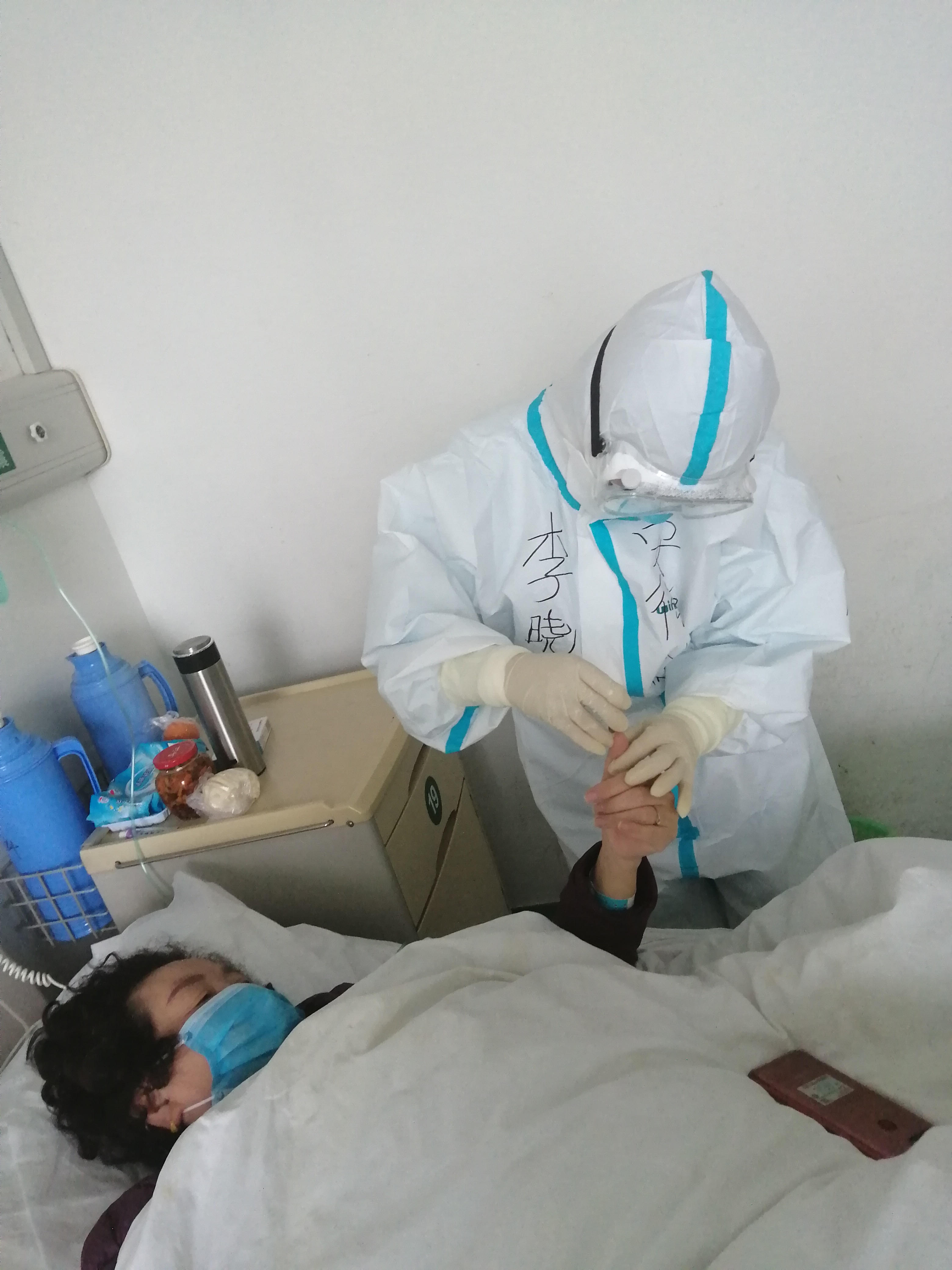 记得第一次上班时,没有把挂耳式的N95口罩松紧度调整好,导致我的耳朵像被刀割样疼痛。下班后,缓冲间外排起了长长的队伍,大家拖着疲惫的身体轮流进去脱下盔甲,洗漱,那一瞬间就感觉如释重负。我站在镜子前,看着脸上口罩的勒痕和脱皮的双手,我觉得自己并不像一个26岁的姑娘,像极了50多岁的老大妈,也不知道是多少天没有化妆、没敷面膜了,觉得自己奇丑无比,可当看到群里发来的:“今天有3个病人出院了”、“17床不吃不喝的老奶奶愿意吃药了”、“39床脾气倔强的阿姨今天终于笑了”、“28床爷爷说舍不得我们,我们就像是他的儿女”这些喜人的消息时,转瞬之间,我又觉得一切都值得了。