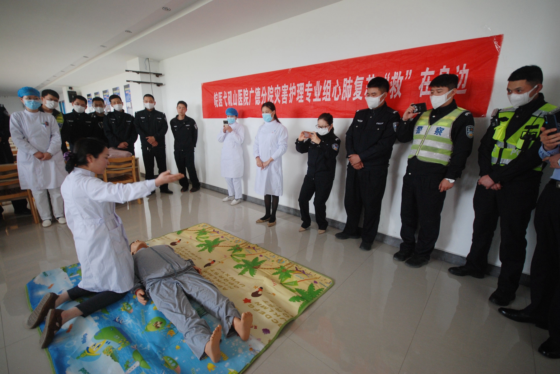 护理部主任杨正霞和急诊科护士长喻红为他们进行心肺复苏技能的培训,确保人人掌握急救技能,在场的交警们认真学习,积极参与,热情高涨,纷纷参与模拟演练。