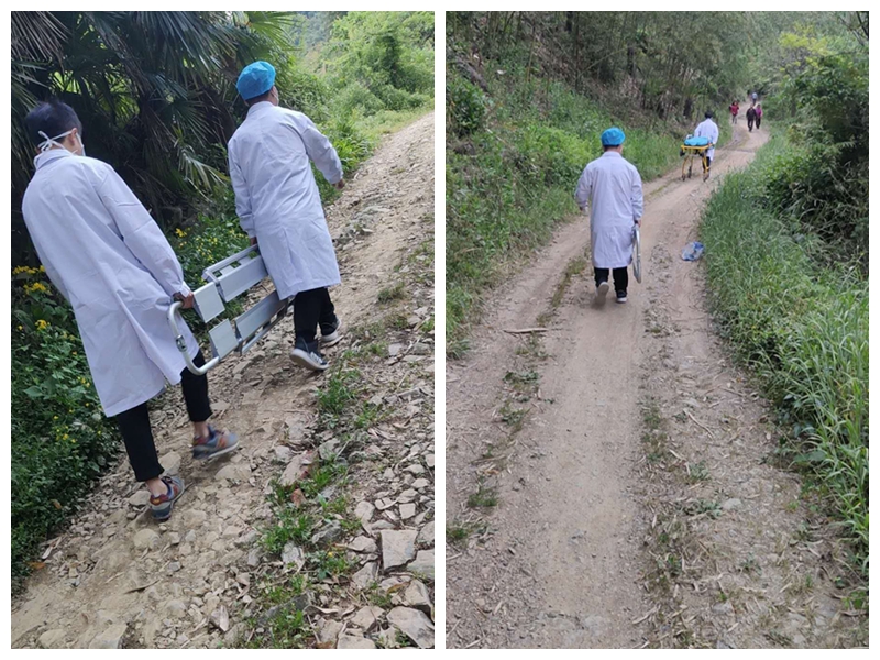 为了能顺利接到病人,吴先龙和龚庆两名急救员手提着担架来回步行了四里多的山路,终于将受伤的吴大叔安全送到了医院。通过一系列检查,吴大叔诊断肋骨骨折、肺挫伤,幸好暂时没有生命危险,目前已经住院治疗。