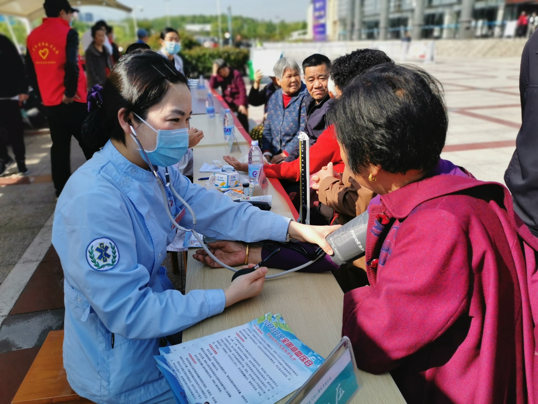 医护志愿者为他们测量血糖、血压,并发放健康宣传资料和防暑药品。