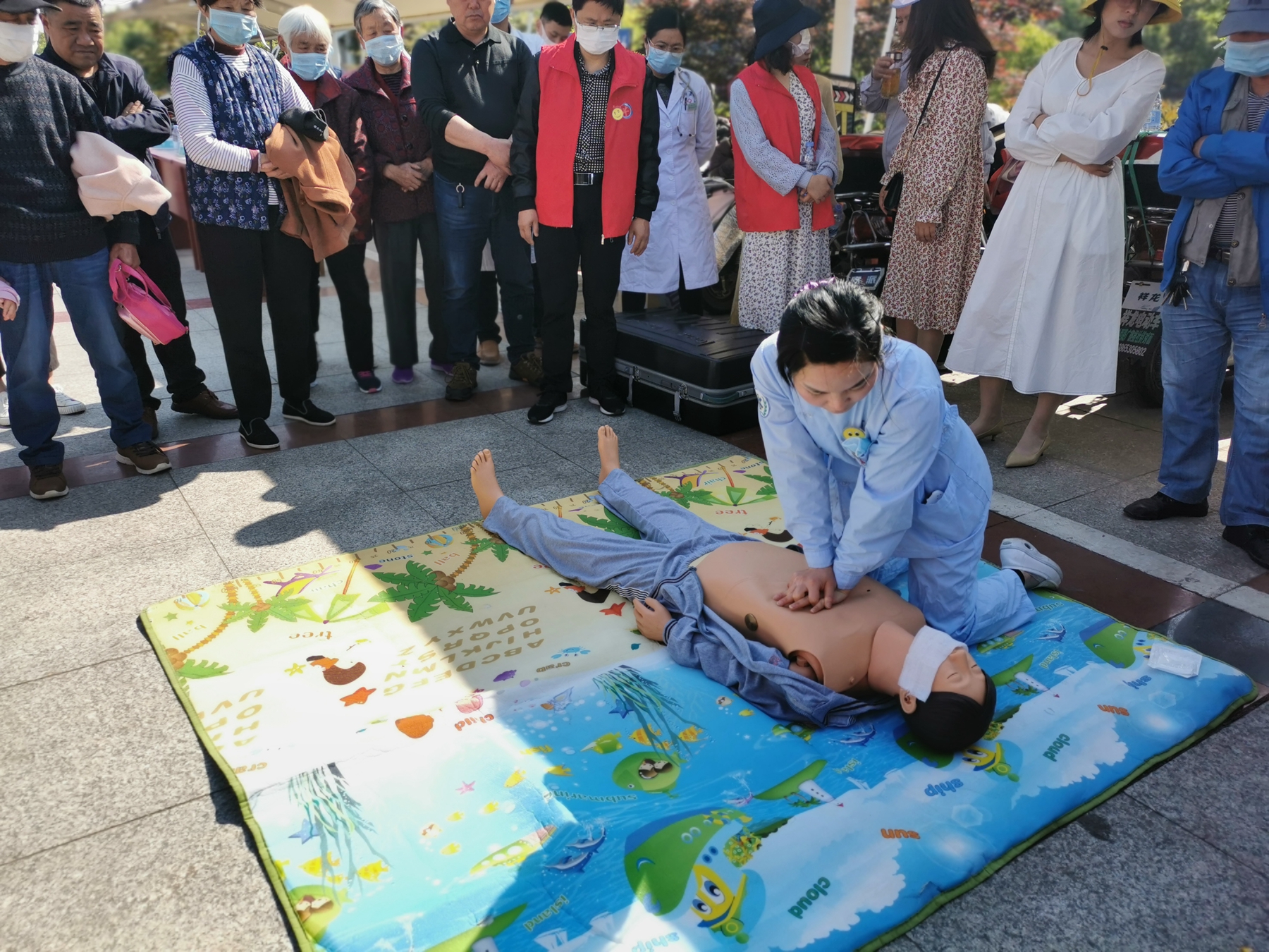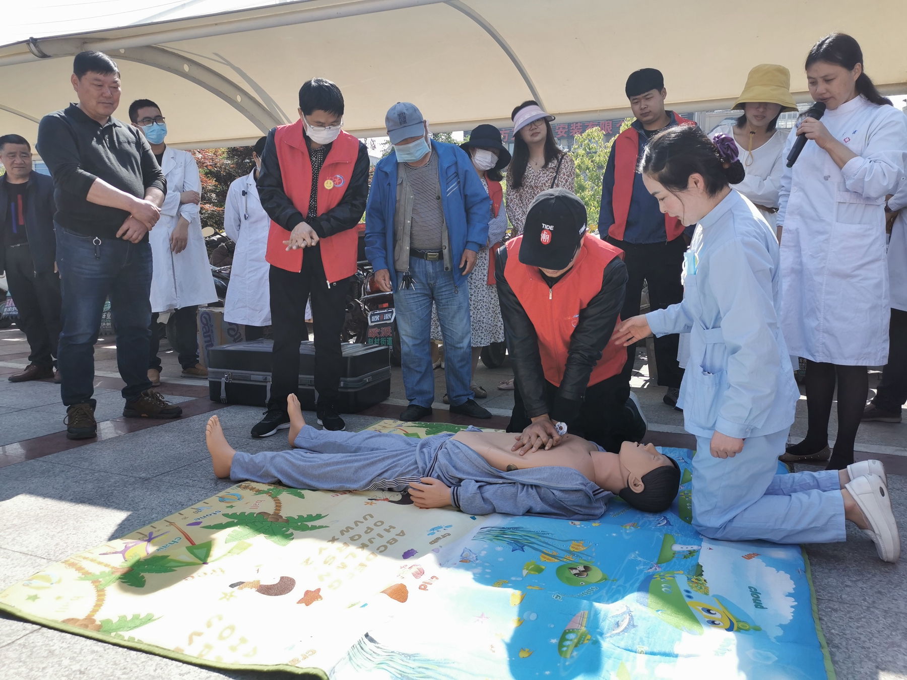 护理部主任杨正霞和急诊科护士长喻红向居民讲解了“心肺复苏”的指征、急救要点以及操作流程,并进行心肺复苏技能的培训,在场的居民对这样的现场急救教学非常感兴趣,看的认真,学的仔细,纷纷参与演练,切实掌握了所学内容。