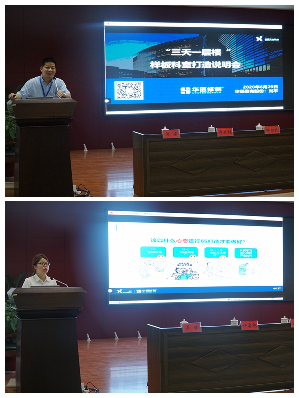 ,华医修制刘平老师和袁喜兰老师对参会人员进行了6S基础知识培训,从“三天一层楼”样板科室打造思路、6S管理的含义、重要性以及具体实施办法等
