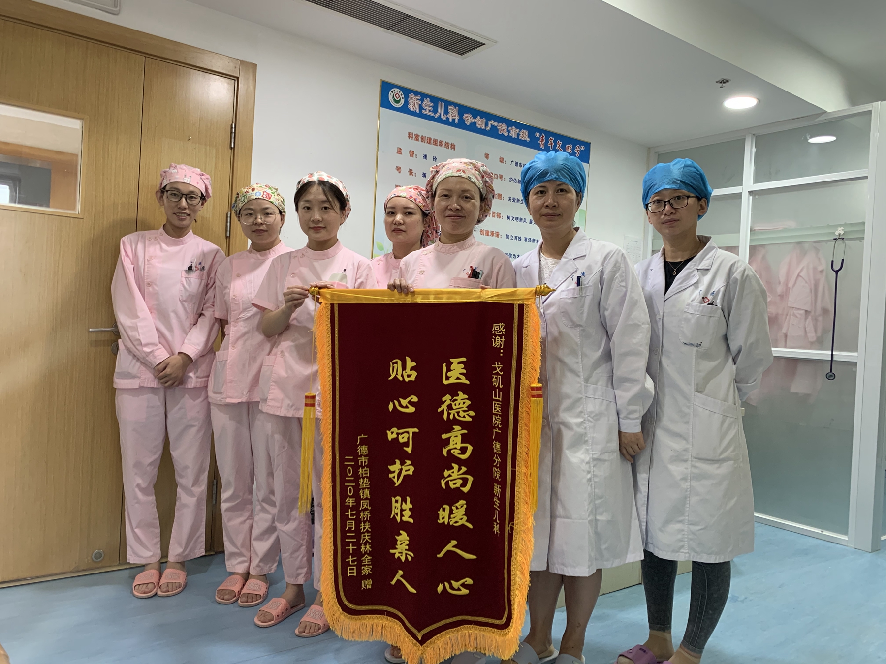 7月28日上午,一名小患者的家属将写有“医德高尚暖人心,贴心呵护胜任亲人”的锦旗,赠送给广德市人民医院新生儿科。
