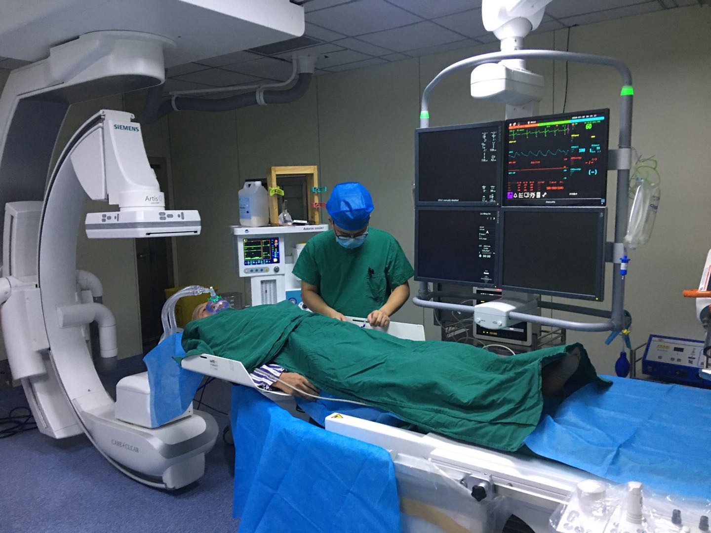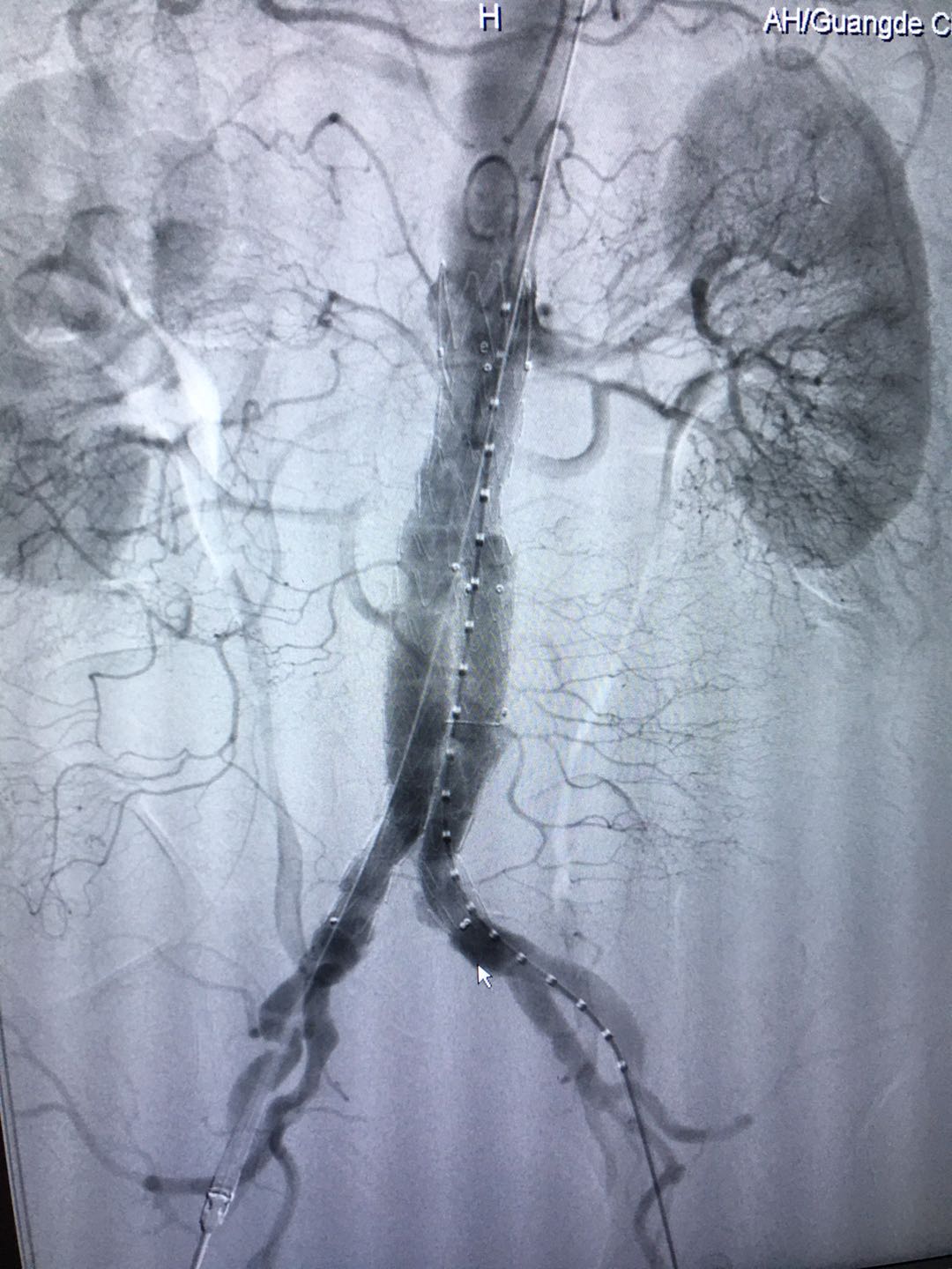 7月18日,在我院导管室,患者在全麻下,经双侧腹股沟小切口,在动脉造影(DSA)监测下,实施腹主动脉瘤腔内隔绝术,术中出血少,创伤小,治疗一周后患者痊愈出院。