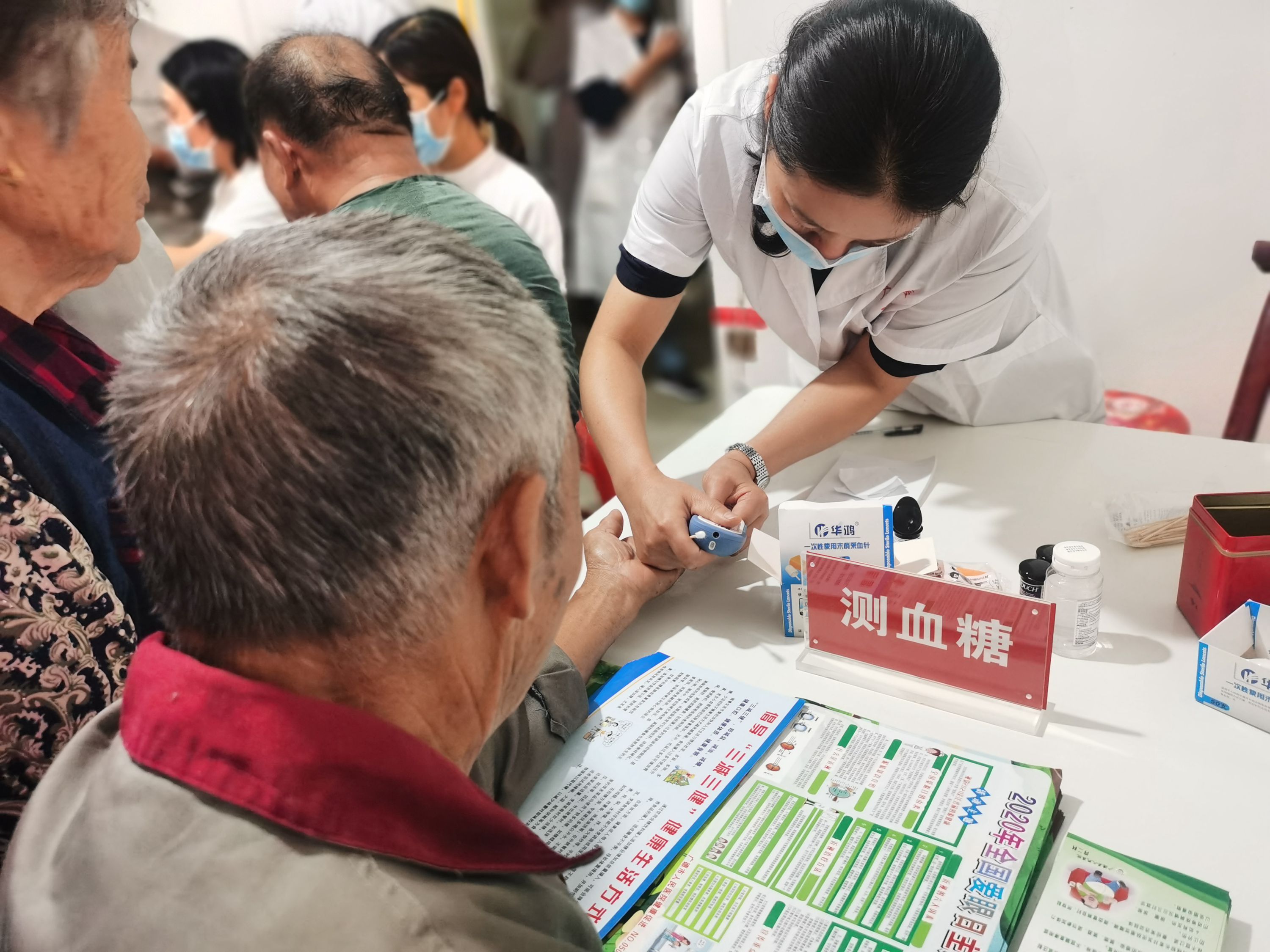 医护人员为群众们测量血压、血糖,发放健康知识宣传手册,