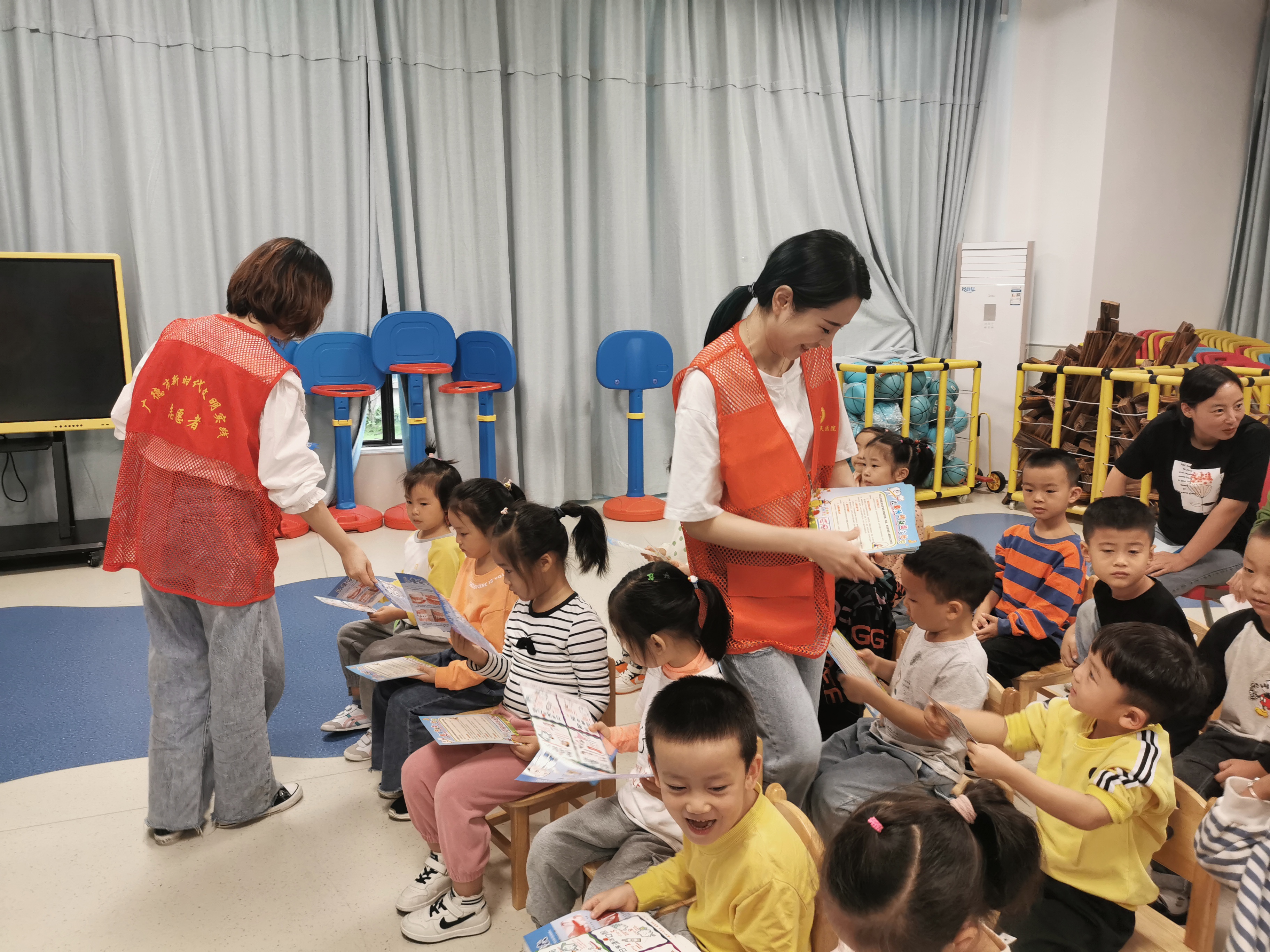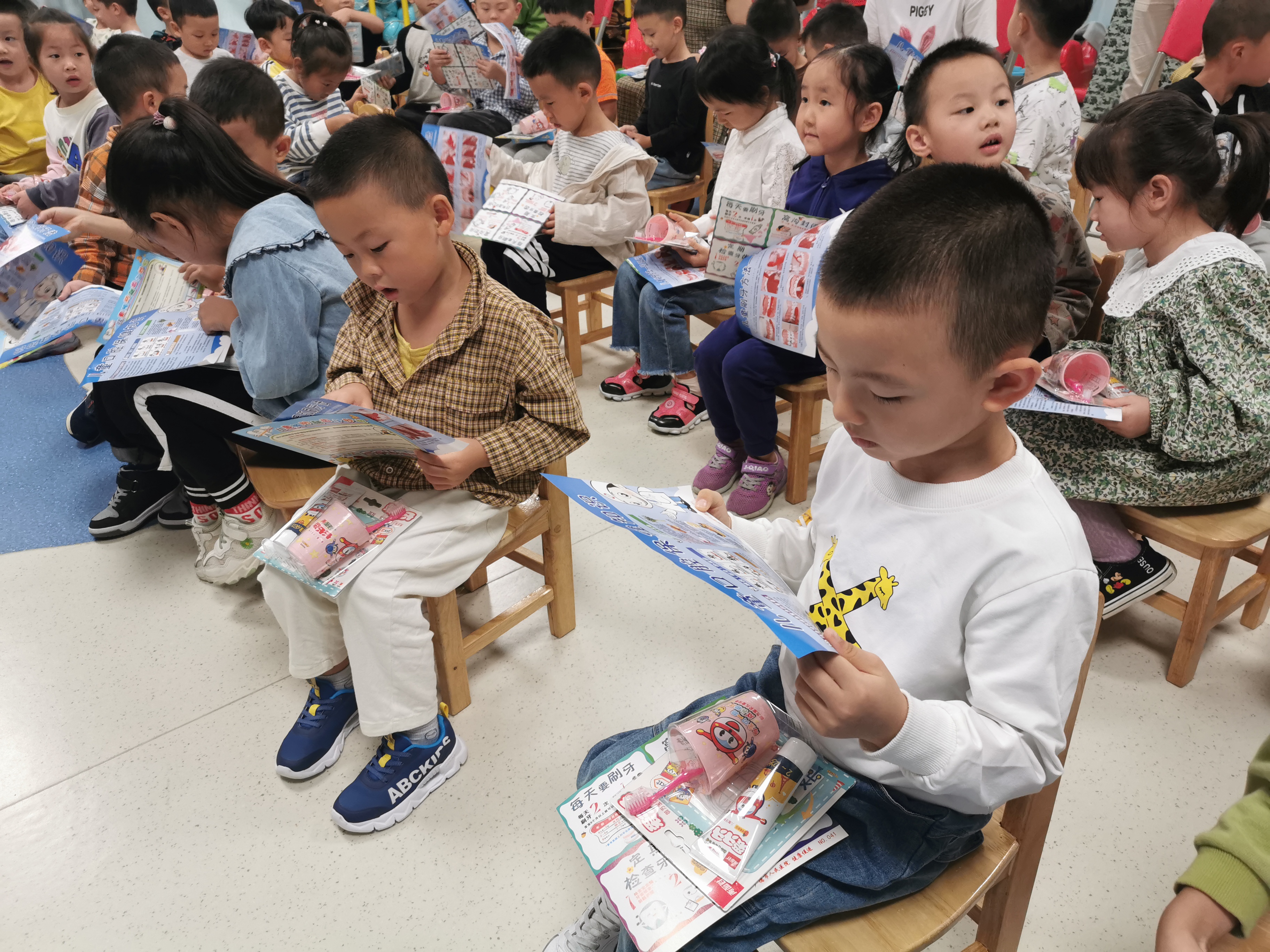 为了帮助小朋友养成良好的刷牙习惯,志愿者们还为小朋友们发放了口腔健康知识宣传单和精美的牙刷牙膏牙具套装,让孩子们更好的保护好牙齿。看!小朋友在认真的看宣传资料哦。
