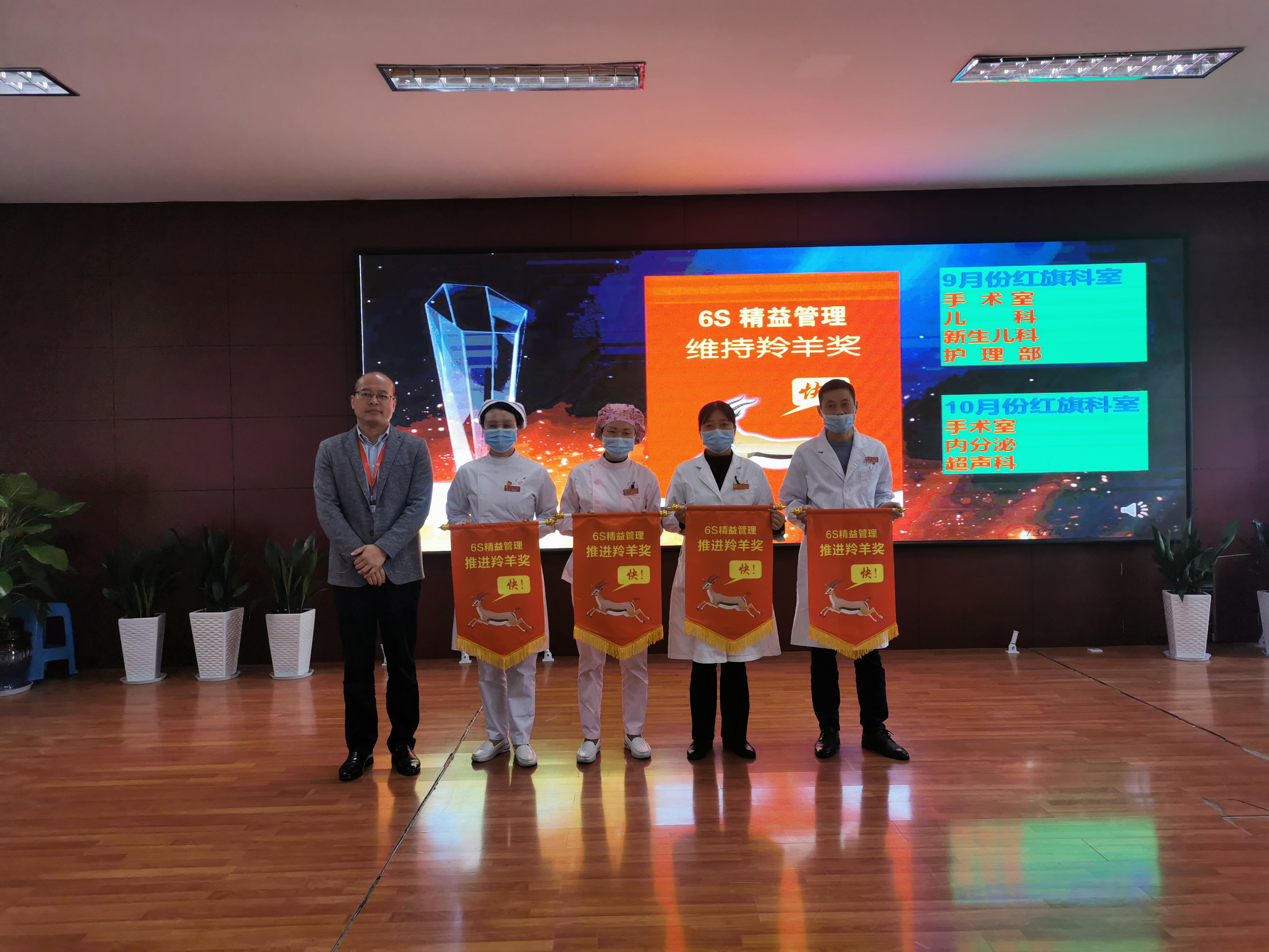 会上对10月份6S竞赛优胜的的手术室、内分泌科、超声科颁发了羚羊旗。并对第六批推广科室进行了授牌。