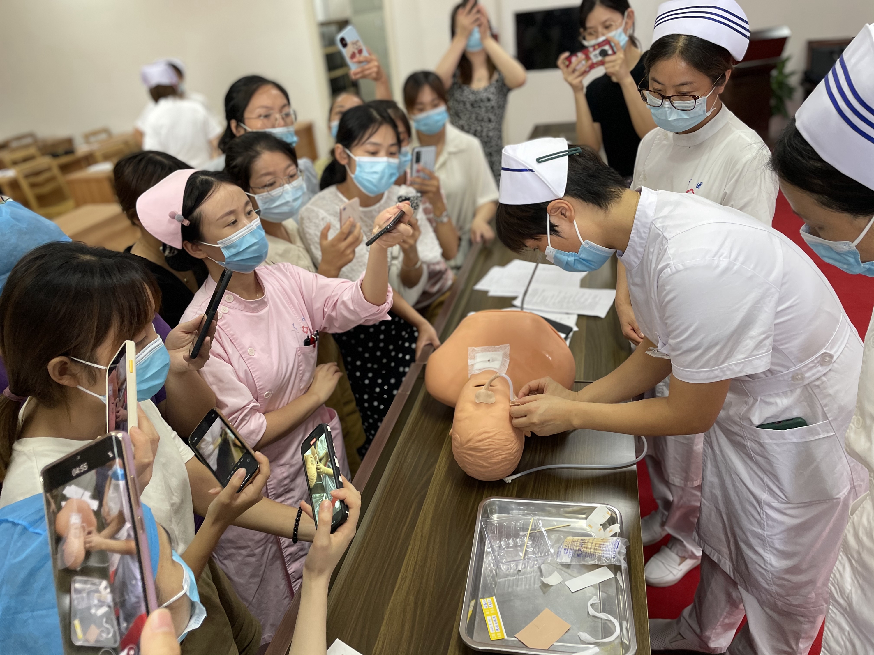 此次培训紧紧围绕“鼻胃管、留置导尿管、胸腹腔引流管”的固定,紧扣行业规范内涵、各类导管的分类、特点、实际应用及其与医用胶布、医用敷贴的相关知识,进行现场讲解,并通过现场演示方式强化了培训。演示讲解后将学员分成三组进行实战操作演练,互相学习讨论,由老师在旁边及时指导纠正。