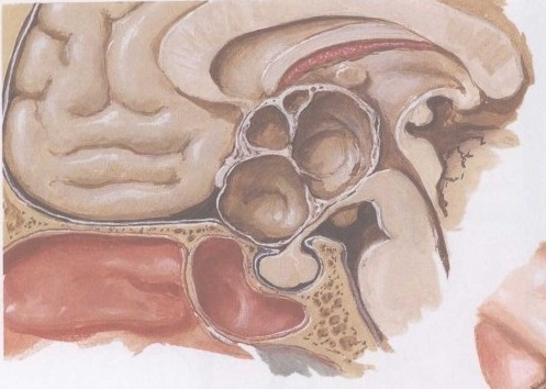 巨大的囊状蝶鞍上颅咽管瘤压迫视交叉和下丘脑,充满了第三脑室室间空(Monro),可引起视力损害、尿崩症和脑积水。