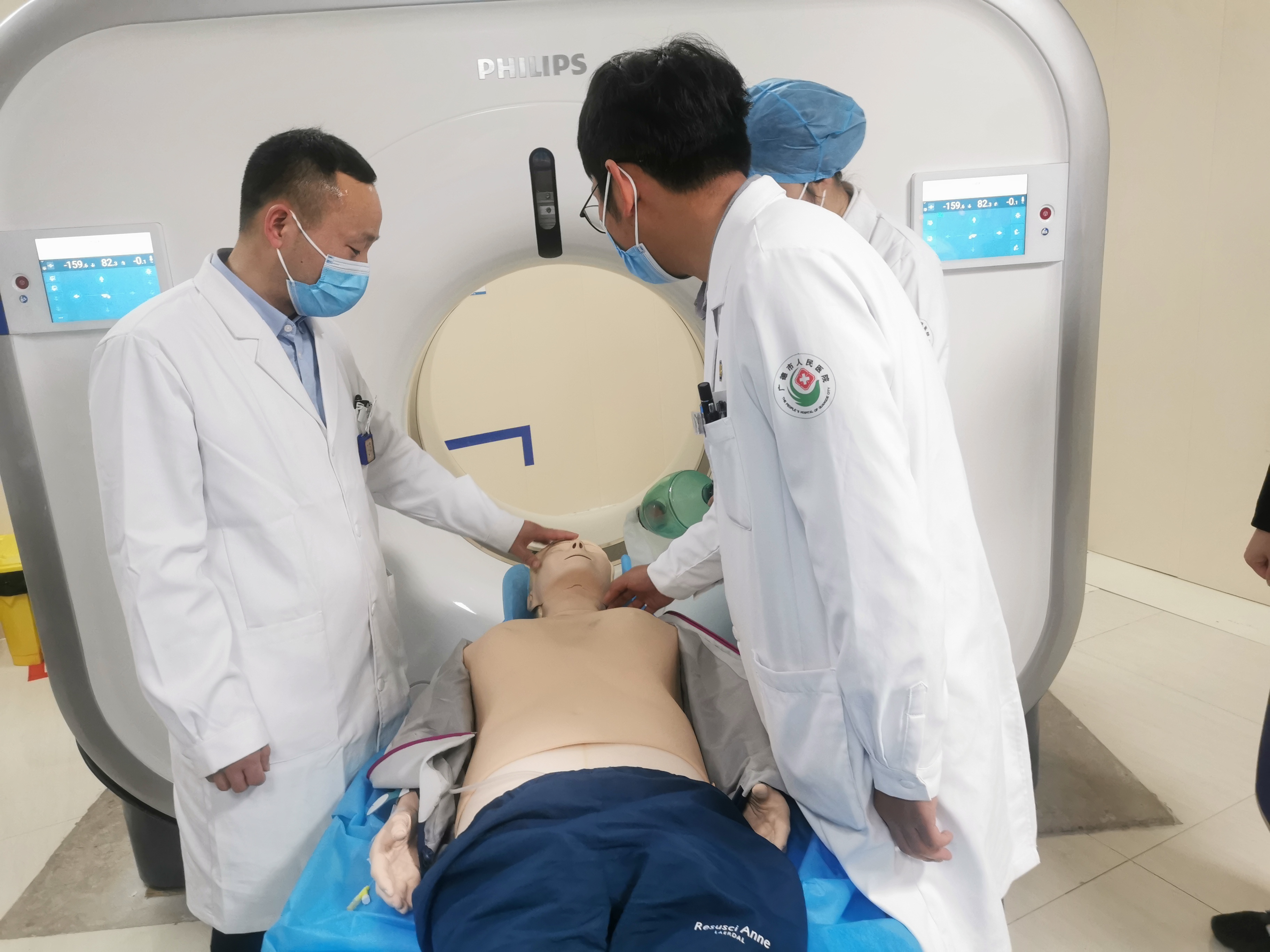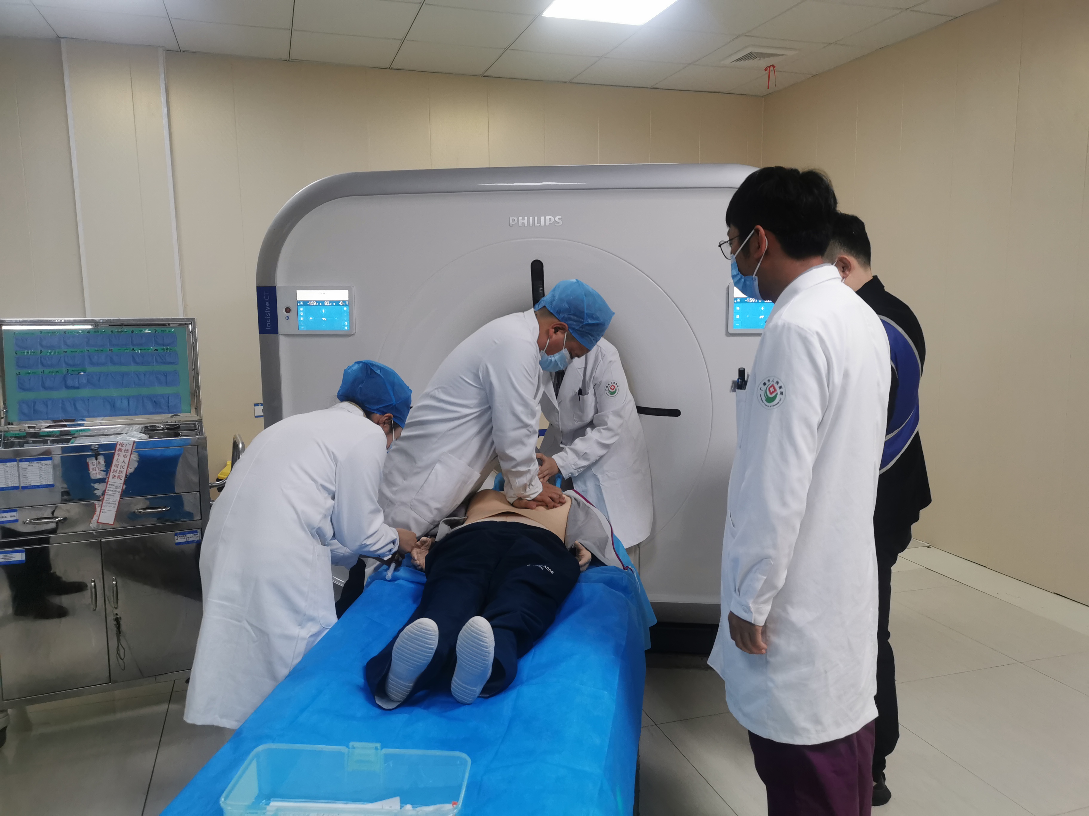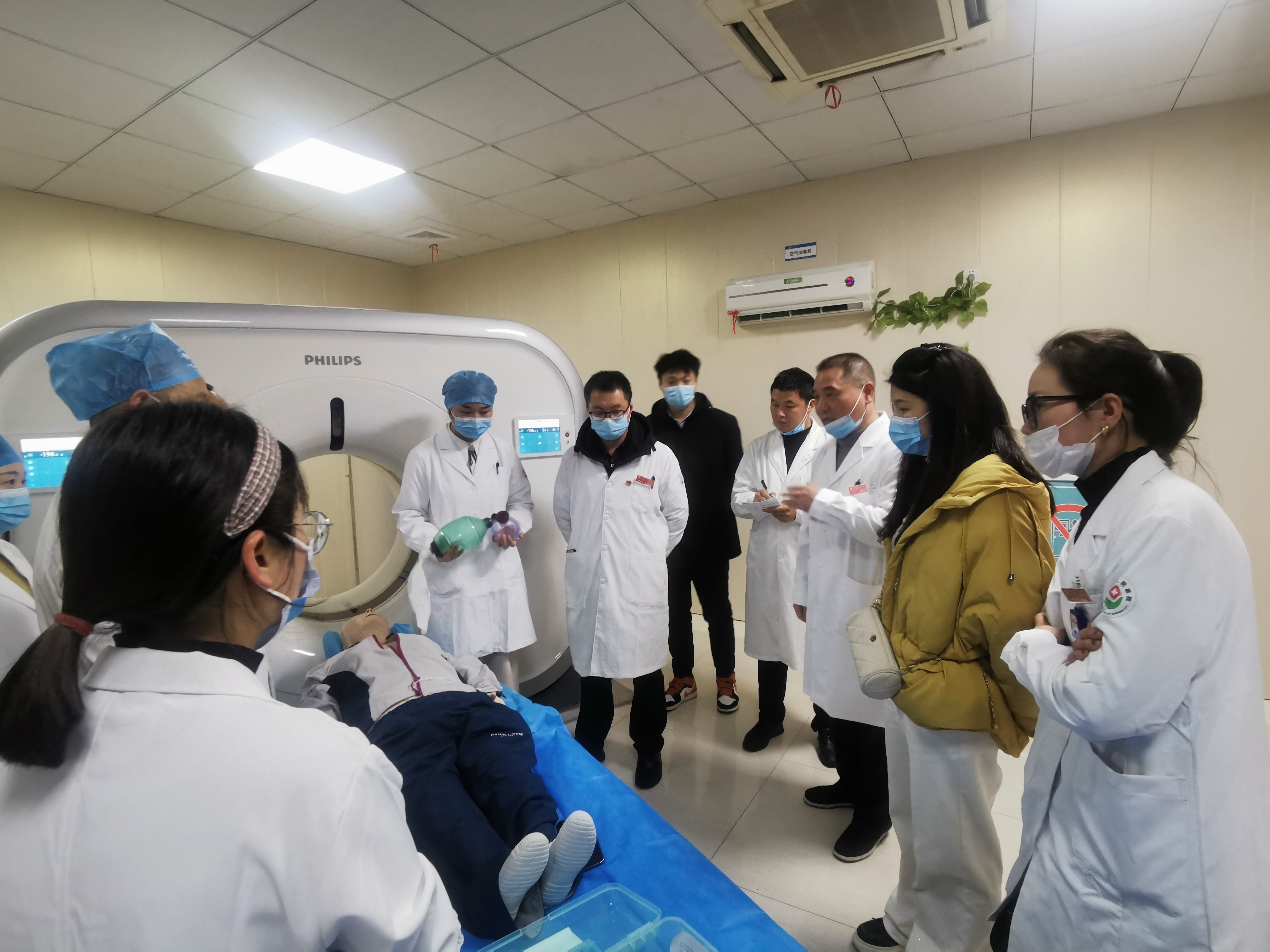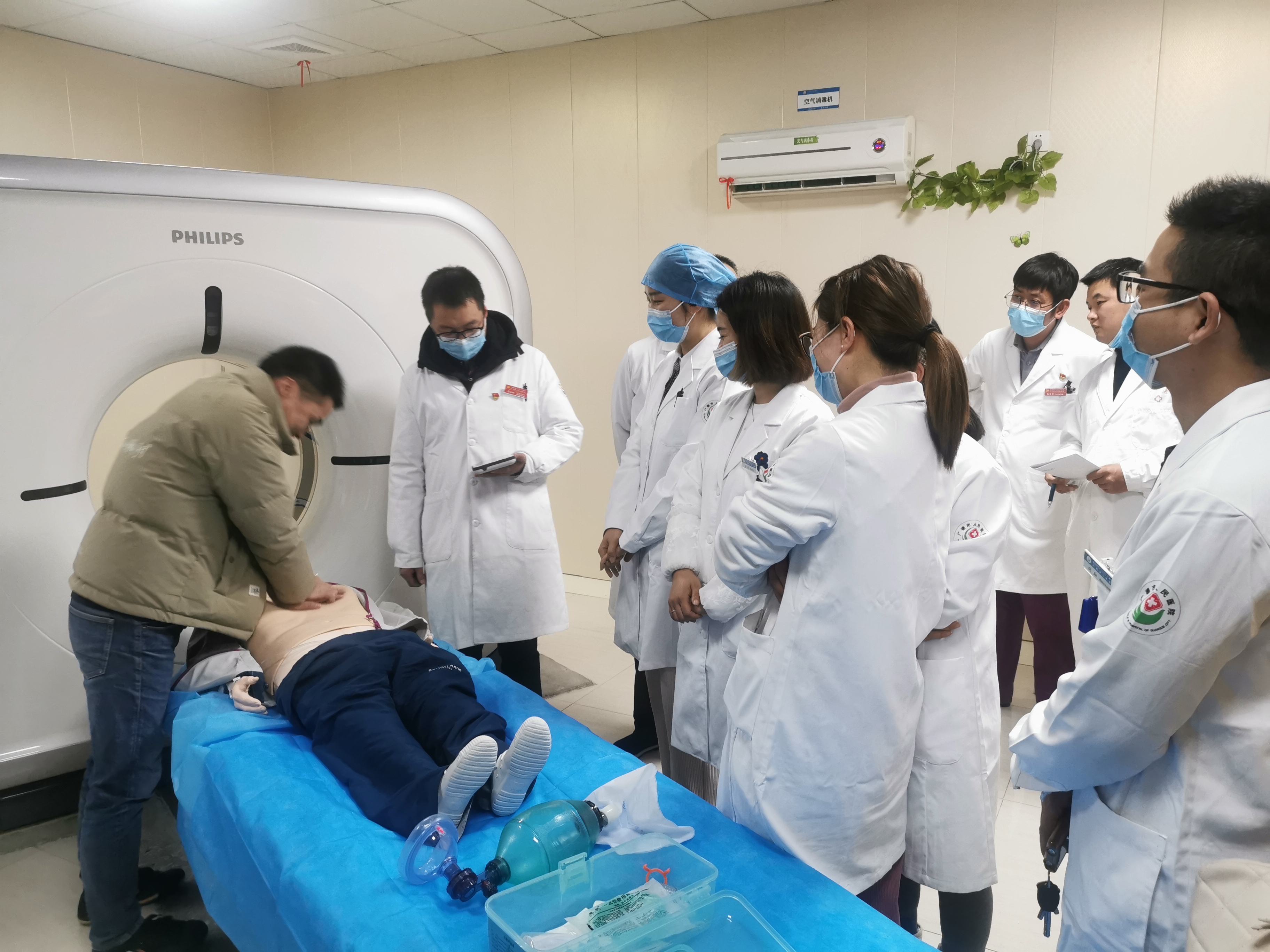 “医生,医生,我家属好像情况不对!”伴随着家属的呼救声,演练正式开始。技术员立即停止碘对比剂注射、停止检查,当班医师、护师迅速进入机房,技师降低检查床,通过检查判断患者出现严重碘对比剂过敏反应并作出相应的抢救措施。