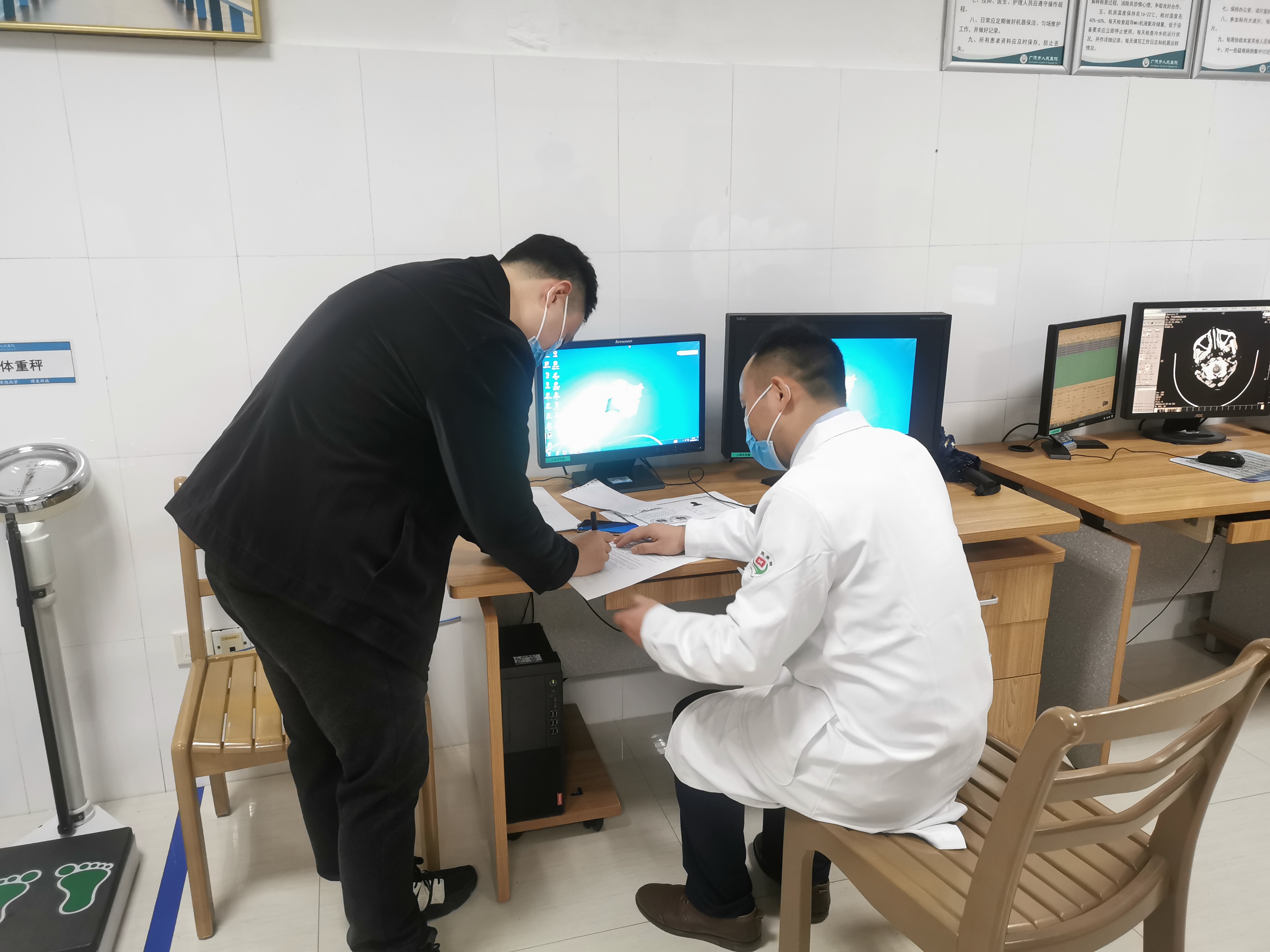 演练模拟一位患者进行腹部CT增强检查,由当天的CT报告医师和家属进行谈话并签写知情同意书,护师为患者开通碘对比剂静脉通道,技术员做扫描准备,开始增强检查。