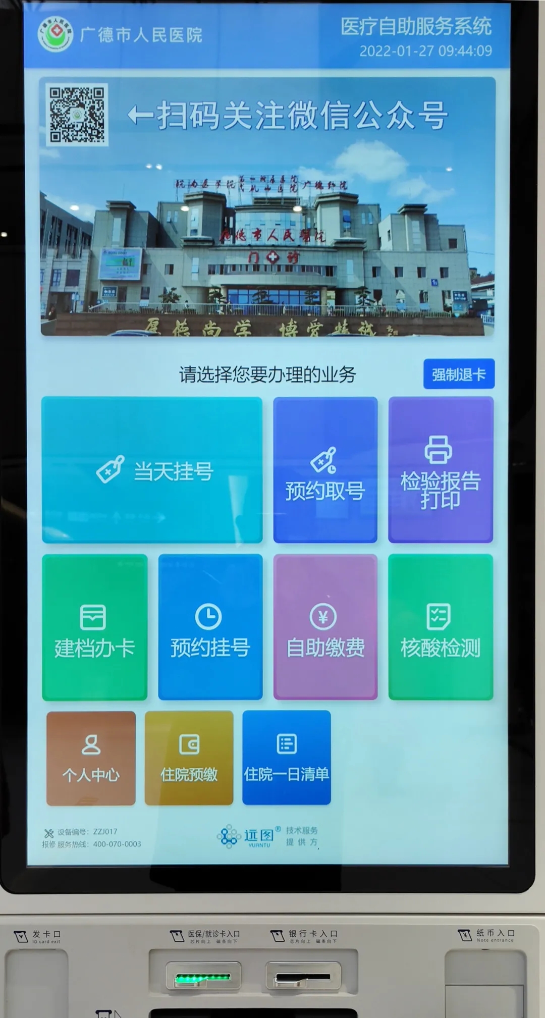 特别提醒,现在做核酸检测,可以在“弋矶山医院广德分院”公众号上预约办理,也可以使用身份证、就诊卡,也可以使用“安康码”、“医保电子凭证”以及“电子健康卡”等多种方式直接在自助机上办理。 此次市医院启用的一站式自助服务机设备界面清晰,操作步骤简单 ,同时为了照顾老年朋友和不方便使用机器的群众使用,每日均有志愿者在自助服务区域指导和帮助操作。这一举措,提高了医院工作效率和服务能力,减少患者往返排队的次数,改善了群众的就医感受,提升了患者满意度。