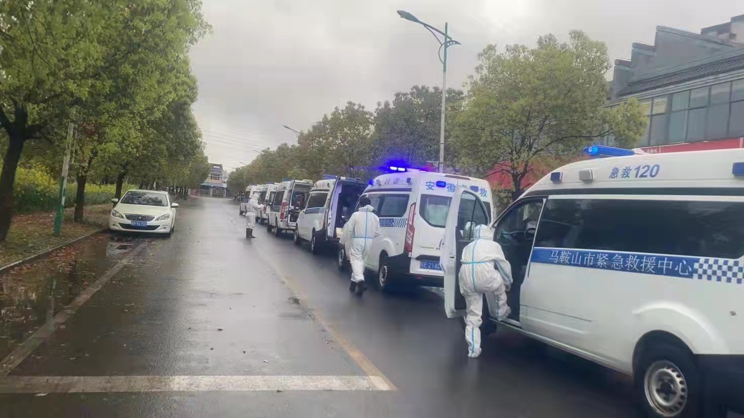 抵达马鞍山市后,根据当地政府安排,李刚和汤万里驾驶的救护车主要承担转运密接及次密接人员,他们立即投入工作中。经常连轴转,一工作就是12小时以上,由于穿着防护服,有时候连饭都顾不上吃,水都来不及喝。顶着压力、扛着疲劳、冒着风险,严格按照当地防疫政策认真工作,他们没有怨言,始终坚持,同事们、朋友们纷纷在微信里留言叮嘱,让他们注意保护好自己,李刚回复到“我们可以坚持,我们没有给广医人丢脸”。