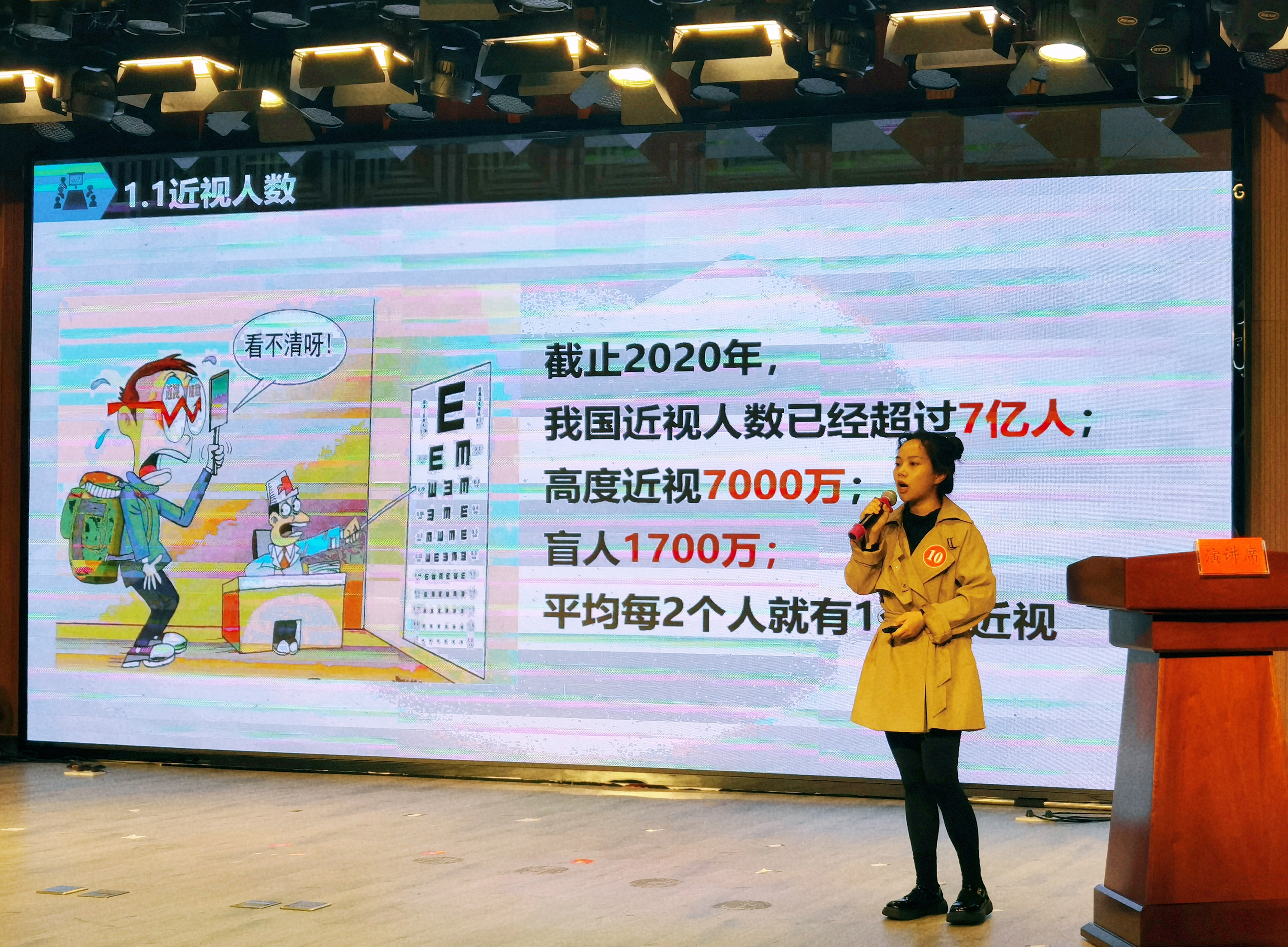 眼科护士杨秋娴演讲的主题是《目浴阳光,为EYE行动》。她从近视的危害、预防近视的方法、眼部的保养等方面,向大家传达了要想“有一眸照人的秋水”,必须从现在开始,为“EYE”行动。