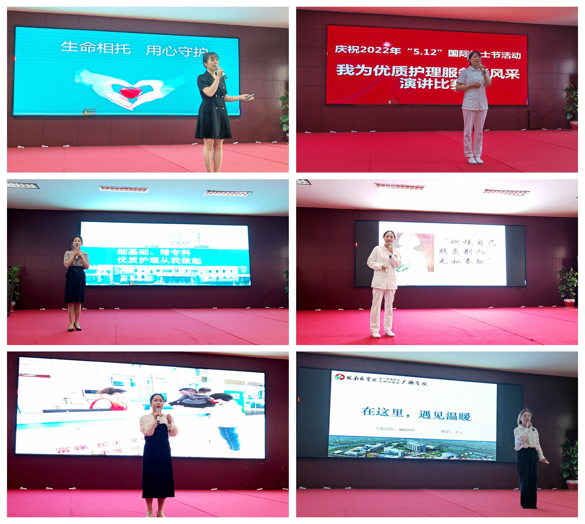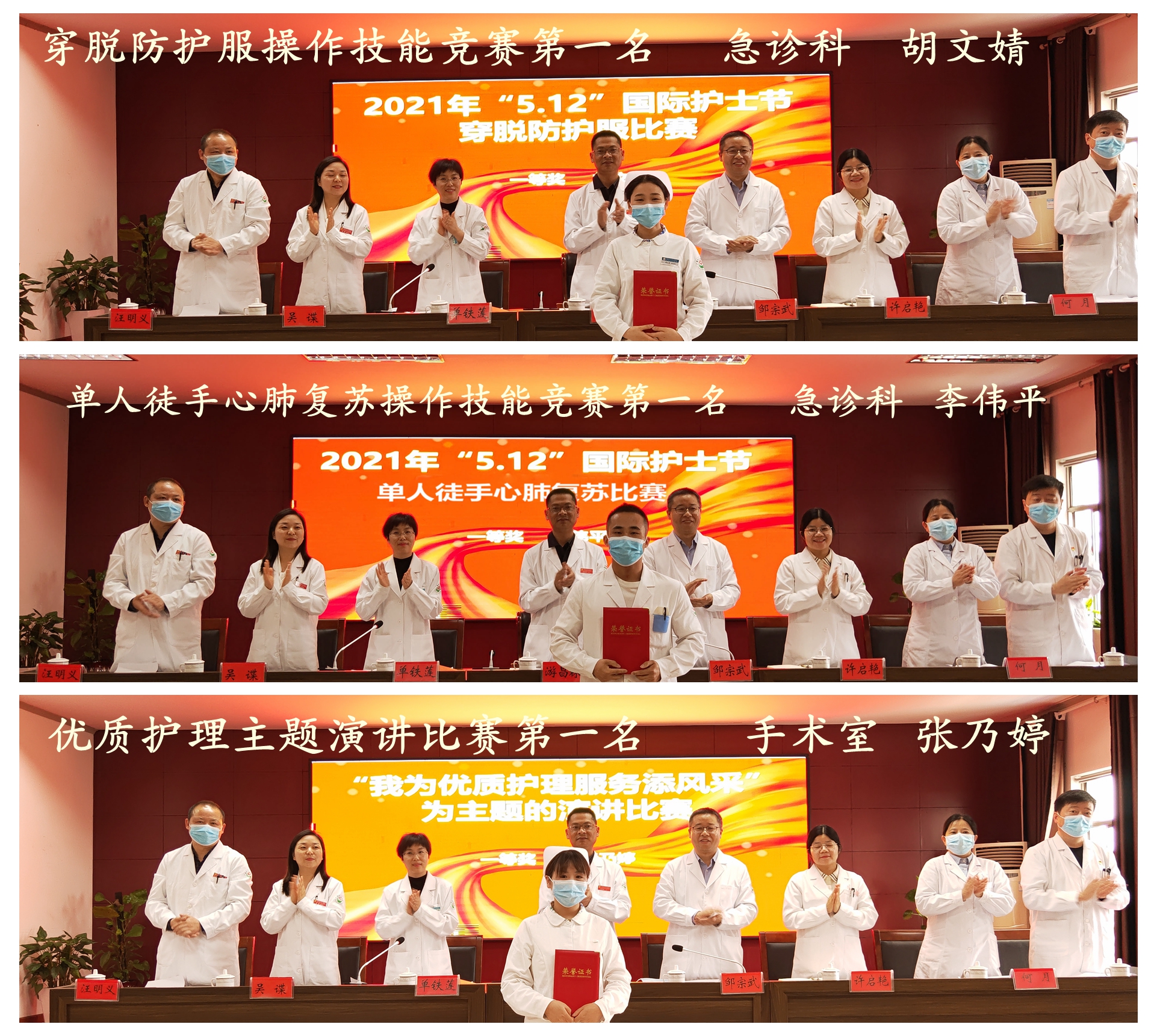 为纪念第111个国际护士节,护理部于5月9日和10日分别举行了单人徒手心肺复苏比赛、穿脱防护服比赛、“我为优质护理服务添风采”为主题的演讲比赛。经过激烈的比赛,现场评选出各项比赛一等奖1名、二等奖2名、三等奖3名。