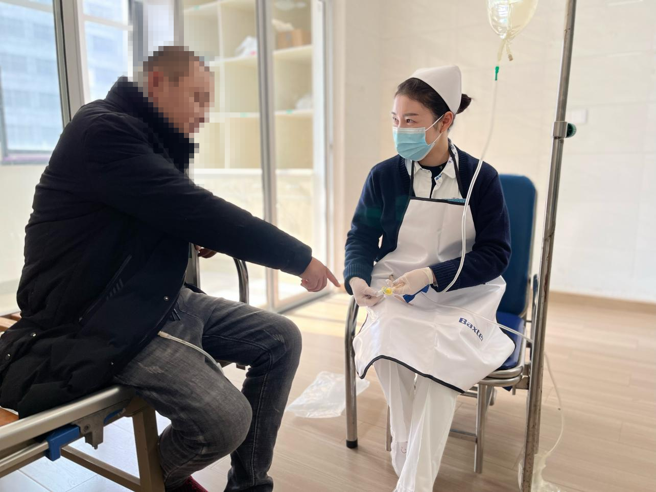 术后肾病学科腹透专科护士认真仔细的给患者做宣教,指导患者怎么行居家腹膜透析治疗。