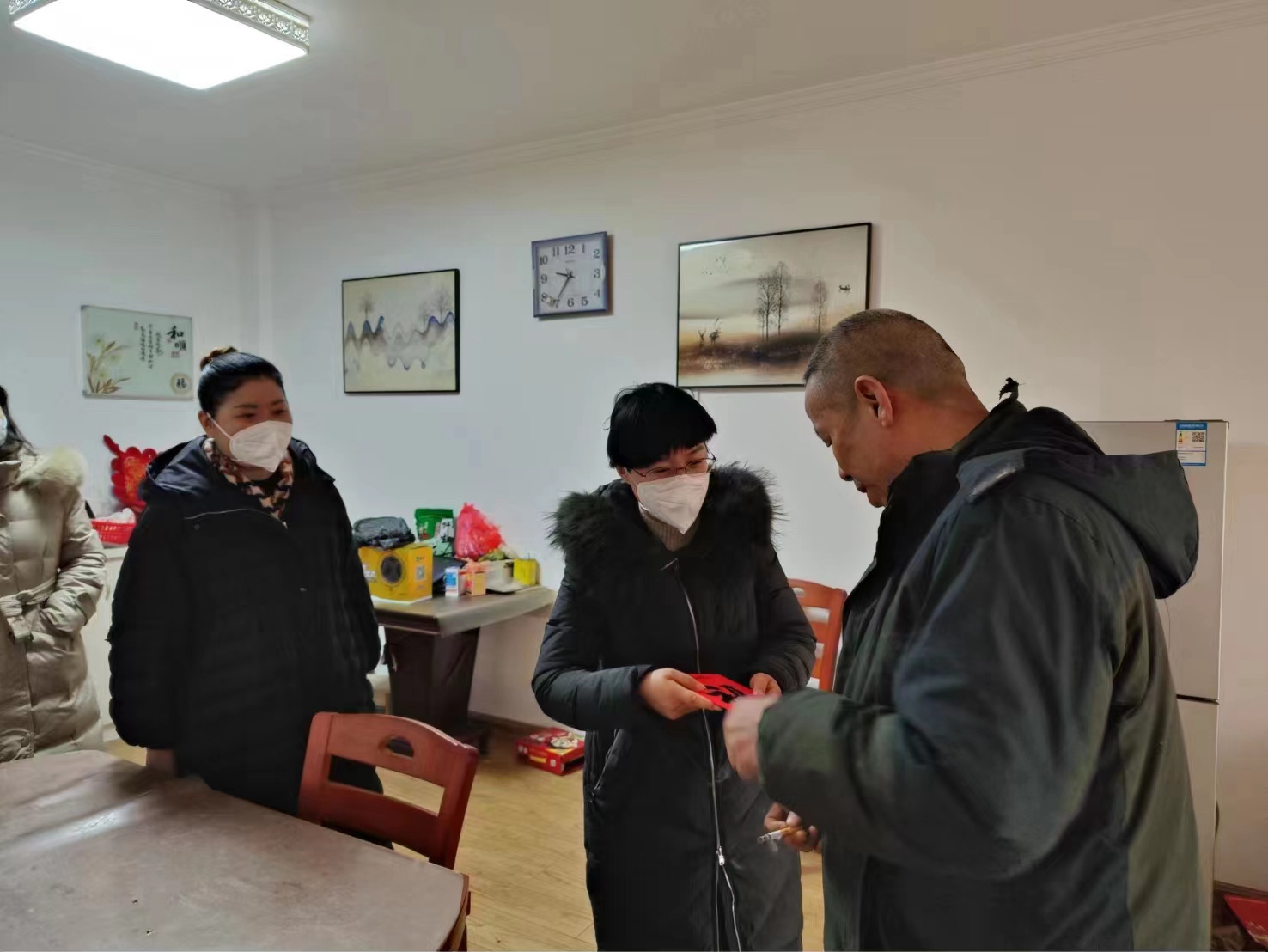 在医院食堂,院领导慰问了患病职工桂学勇的家属,送去慰问金和医院的关心关爱,希望他早日康复并祝他们新春快乐。