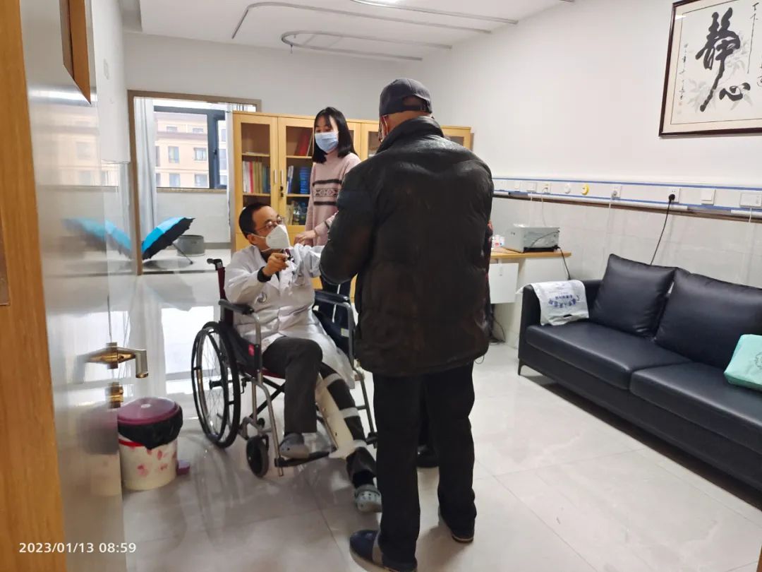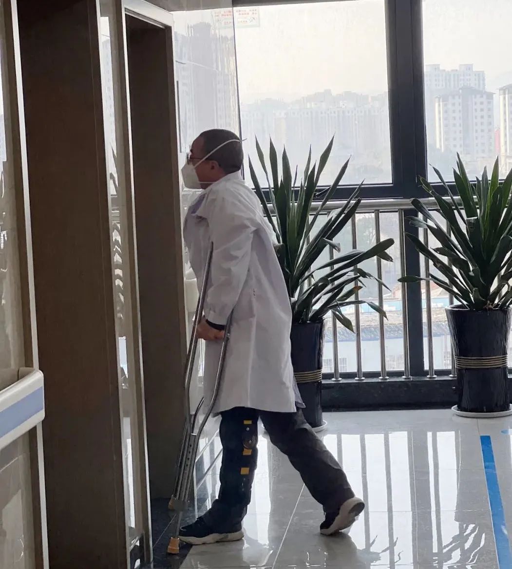 第二天,邱五一戴着沉重的骨科护具,坐着轮椅回到了科室继续工作。自此以后,每天早上由家人开车送他到医院,再坐上轮椅,来到科室,拄着拐杖一个病房一个病床的查房、问诊,查完房后接着组织科室医务人员讨论患者的最佳治疗方案。