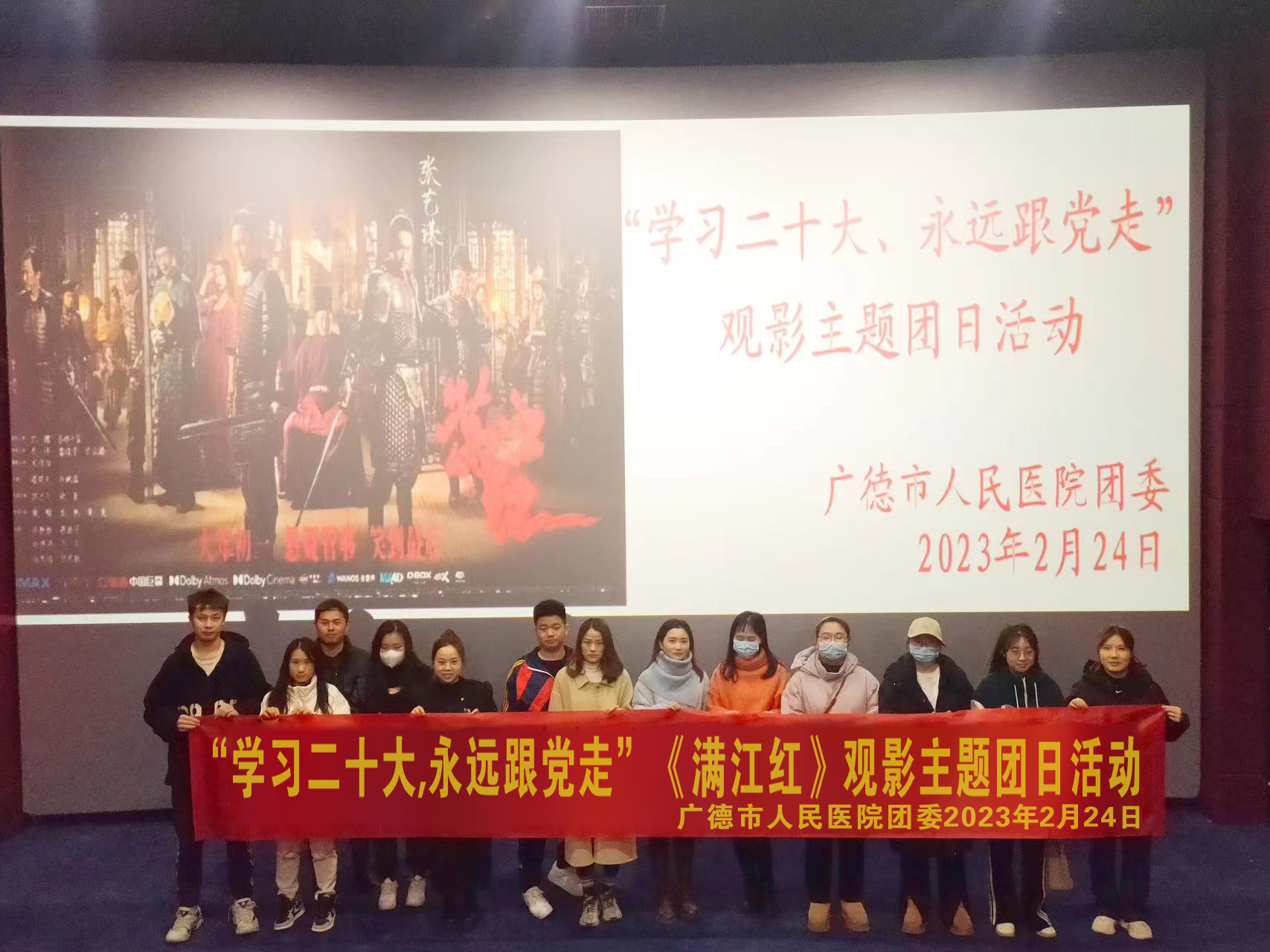 为深入学习贯彻党的二十大精神,进一步弘扬爱国主义精神和民族团结精神,发挥团委服务引导青年的作用,2月24日,广德市人民医院团委开展“学习二十大、永远跟党走”《满江红》观影主题团日活动,同时为了营造医院拥军爱军氛围,特邀请我院退役军人参与此次观影活动。