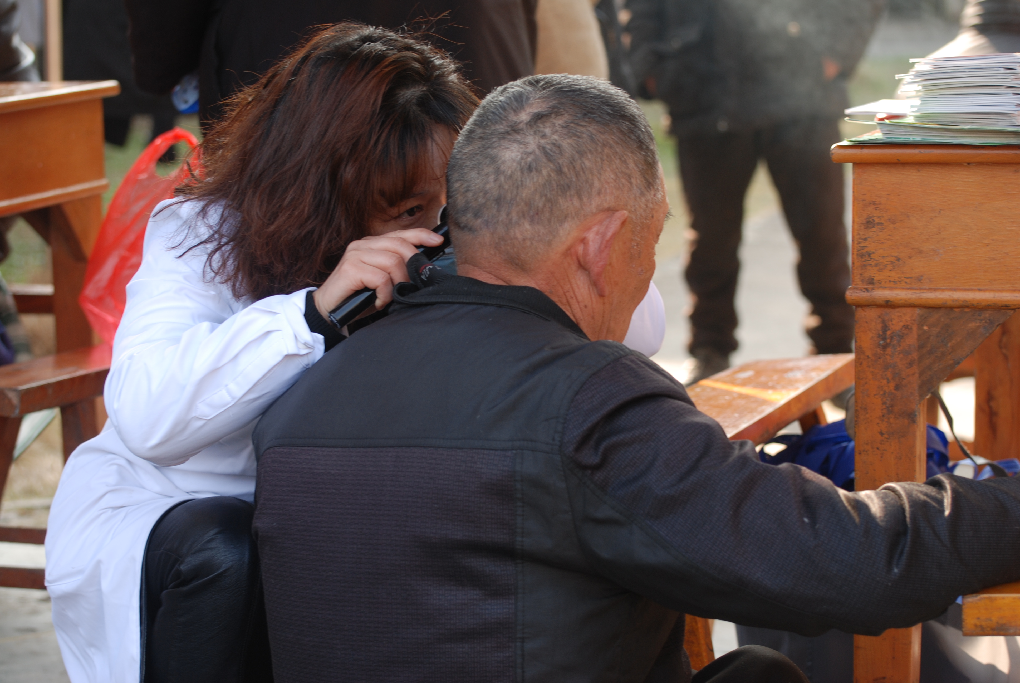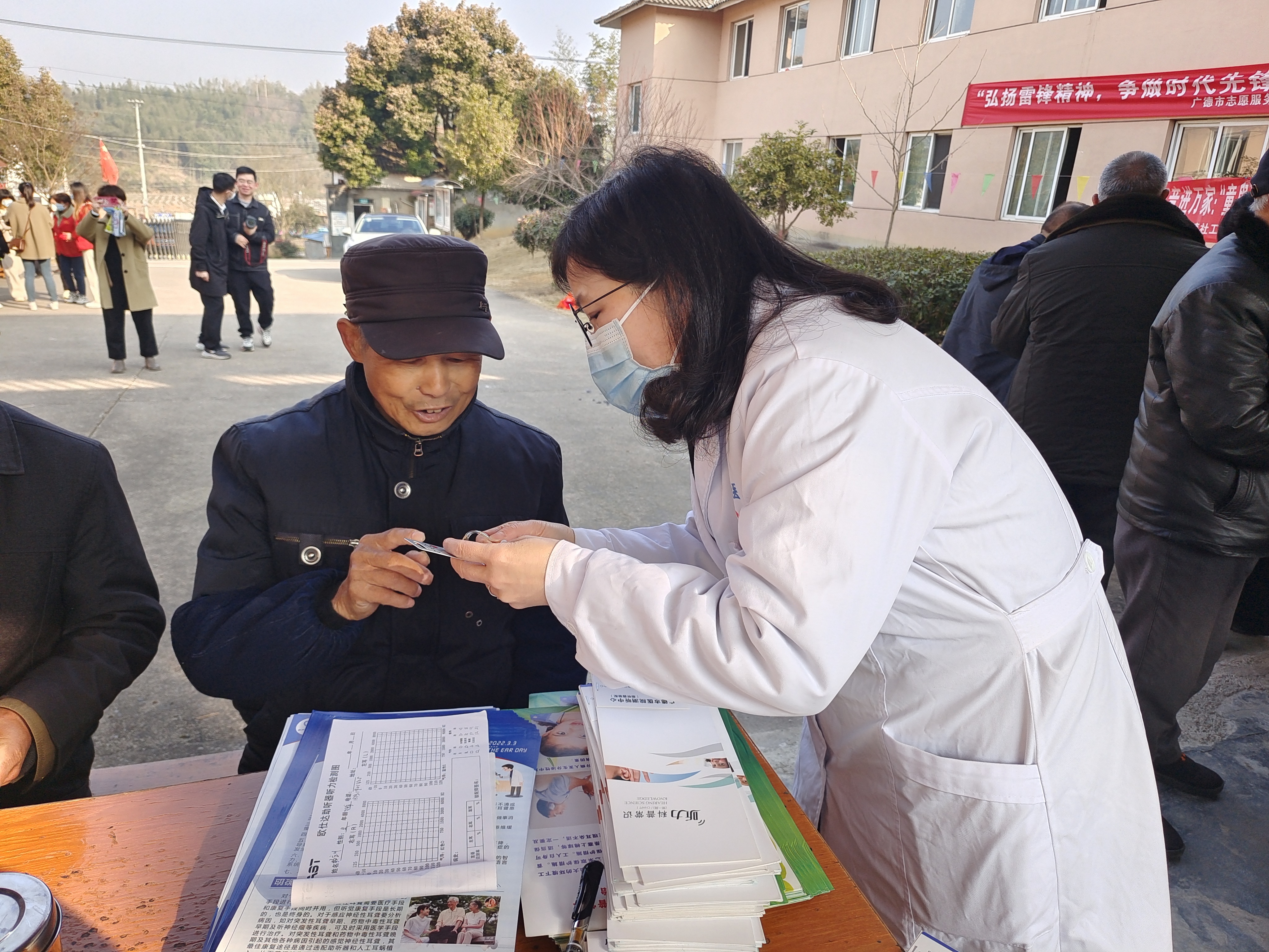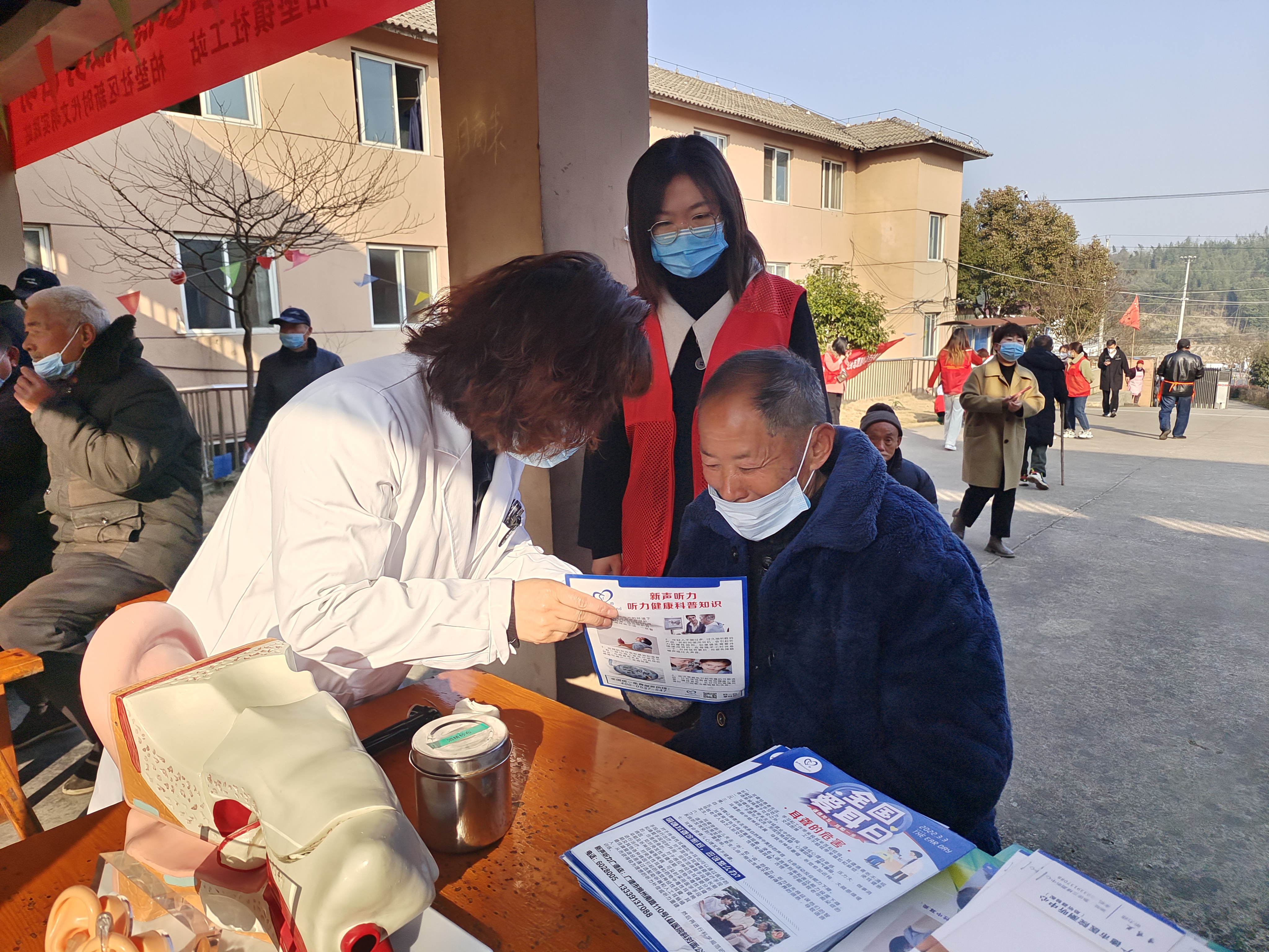 耳鼻咽喉科医护人员为老人们检查耳部疾患、听损分析咨询、帮助他们调试保养助听器,发放耳部疾病防治及健康宣传资料。