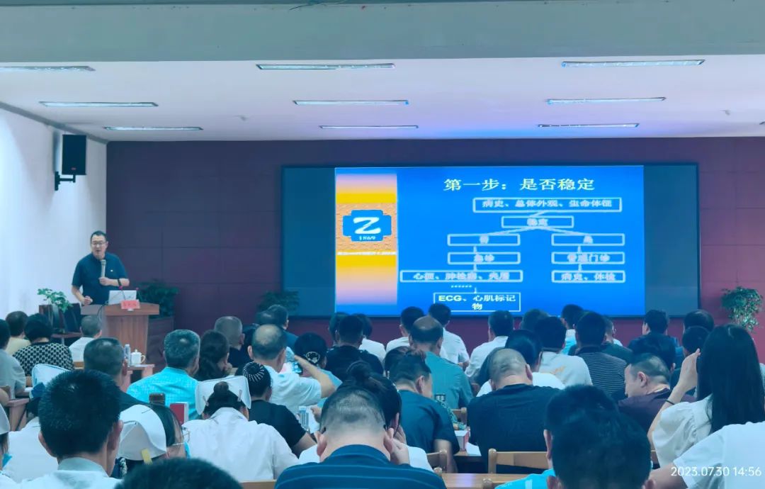 为加快推进我院胸痛中心的规范化建设,7月30日下午,我院举行了胸痛中心建设推进会暨培训会。浙江大学医学院附属第二医院心血管内科副主任、主任医师李长岭,副主任医师徐其渊、市卫健委副主任解本建、我院领导班子成员,我市各乡镇卫生院、社区卫生服务中心、民营医疗机构的内科医生和全科医生、辖区内各村卫生室负责人参加会议。