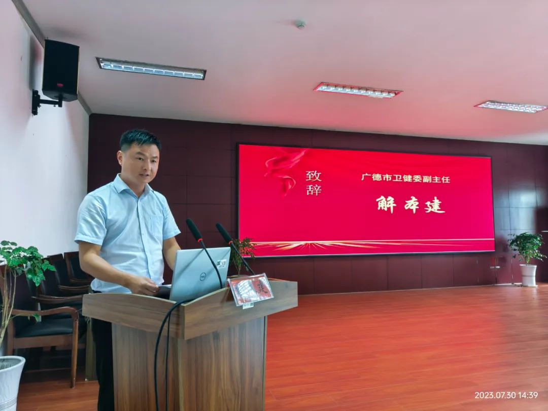 市卫健委副主任解本建致辞,他指出:创建胸痛中心是及时救治、快速诊断、规范治疗、降低胸痛患者死亡率的有效途径,也是一项惠民工程、德政工程和民心工程。胸痛中心建设是县级医院提质升级的需要,更是实施“健康广德”战略的重要体现。全市各级医疗机构要以更加务实的作风,更加饱满的热情,积极投身急诊急救事业的光荣实践中去,继续做好做强急诊急救的“最后一公里”,持续推动我市急救医学工作再上新台阶。
