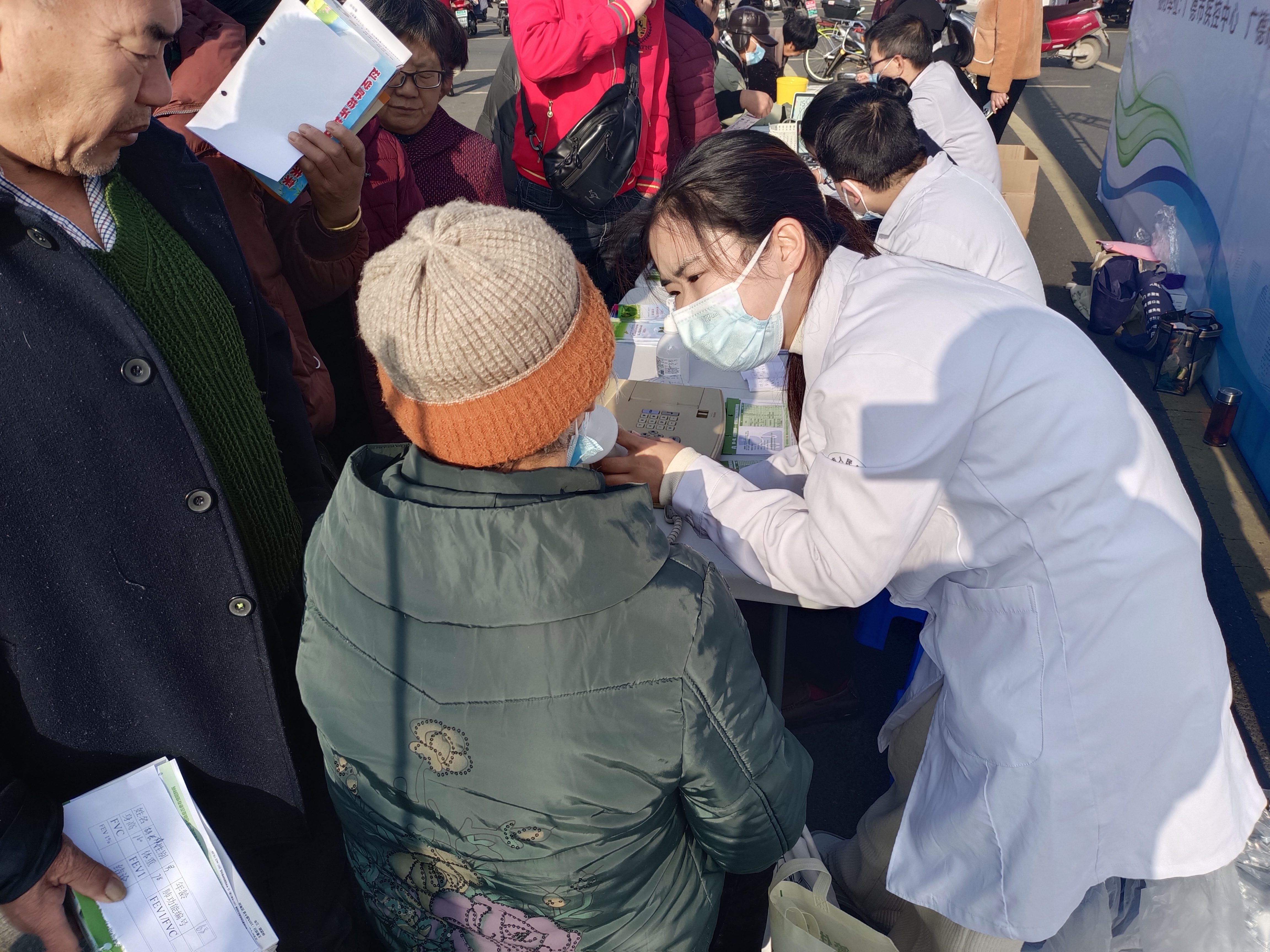 肺功能技师许志艳为群众开展肺功能检测,陈晨、汪雪琴等护士为群众测量血压,发放宣传单开展健康宣教。