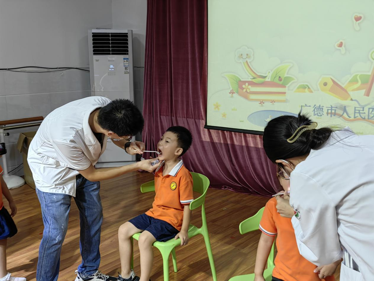 口腔科杨孙庆、杨天两位医生仔细检查了小朋友们的牙齿,并针对性提出了口腔疾病预防的相关建议。
