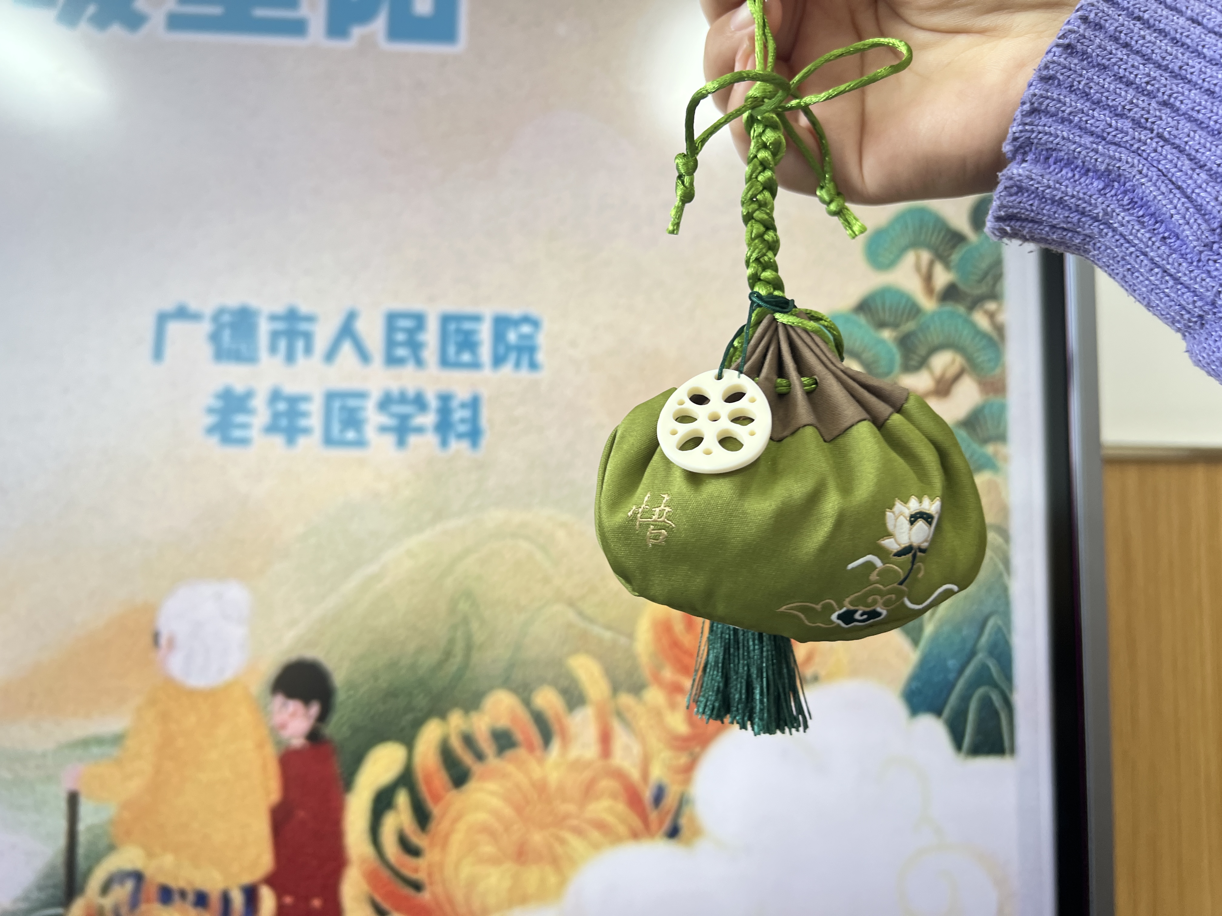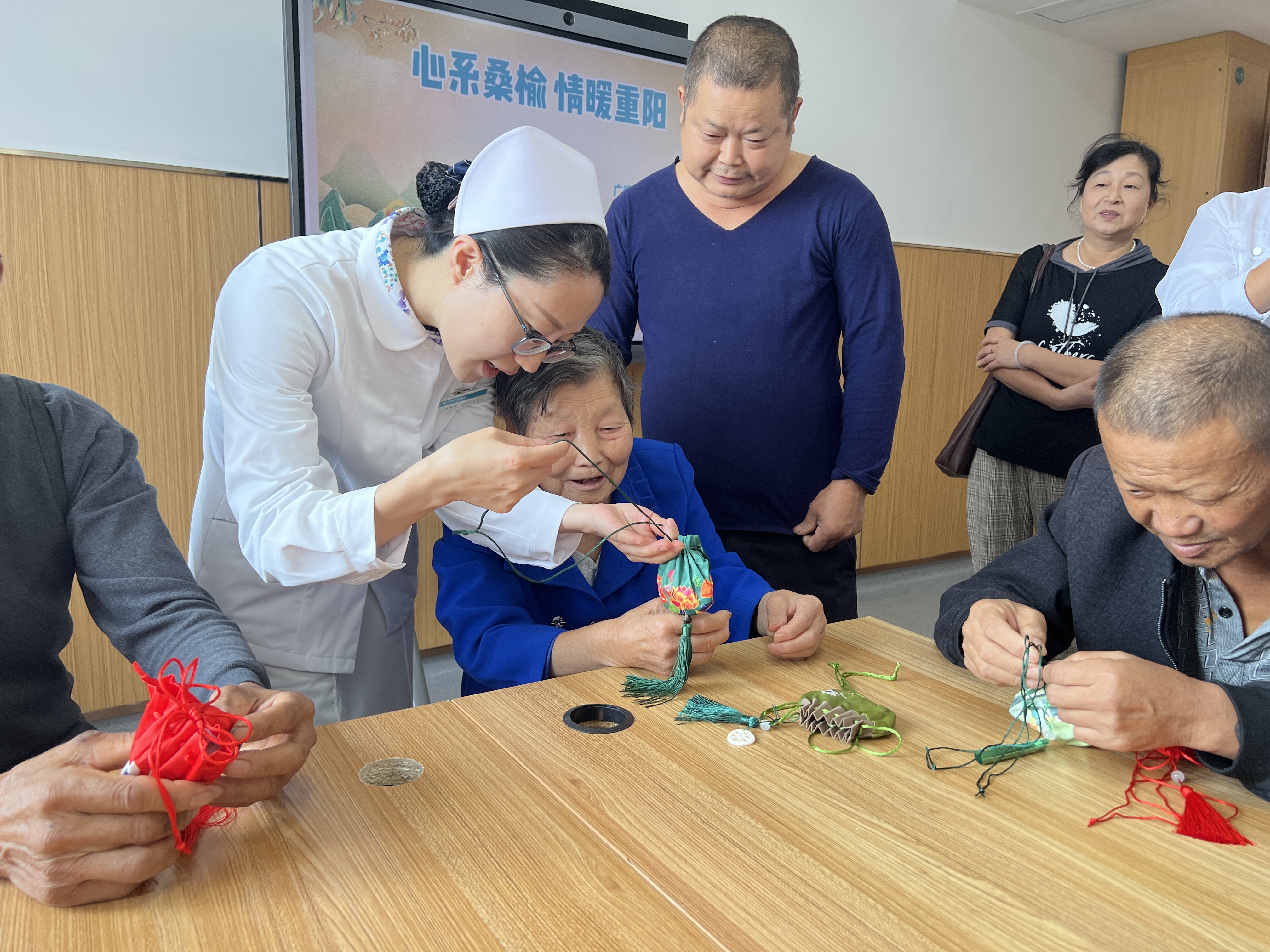 重阳节佩茱萸香囊的传统习俗,蕴含着深厚的文化底蕴。医护人员细心介绍香囊制作过程,将预先备好的茱萸香料与各式香包材料发放给大家,引导老人们动手制作。在一片欢声笑语中,一只只精致香囊逐渐成型,散发出淡淡的草药香气,既美观又能净化空气,成为病房中一道亮丽风景线。