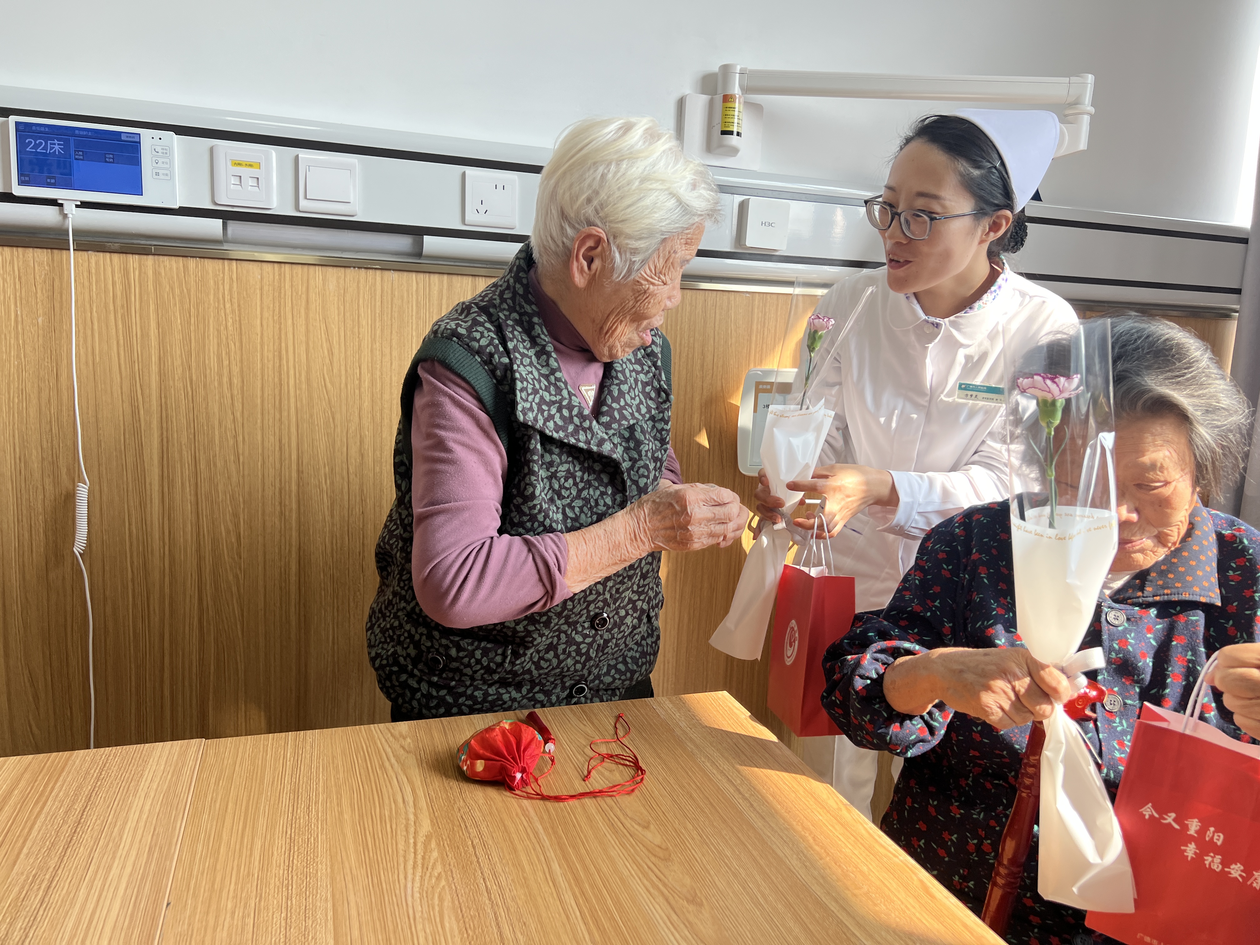 伴随着温馨的音乐,全体医护人员为住院老人送上精心挑选的礼物——象征平安的苹果、寓意吉祥如意的桔子、寄寓早日康复的康乃馨及实用的健康宣教手册。每一份礼物,都承载着医护人员的关怀与祝福,老人们脸上的笑容是对我们最大的褒奖。
