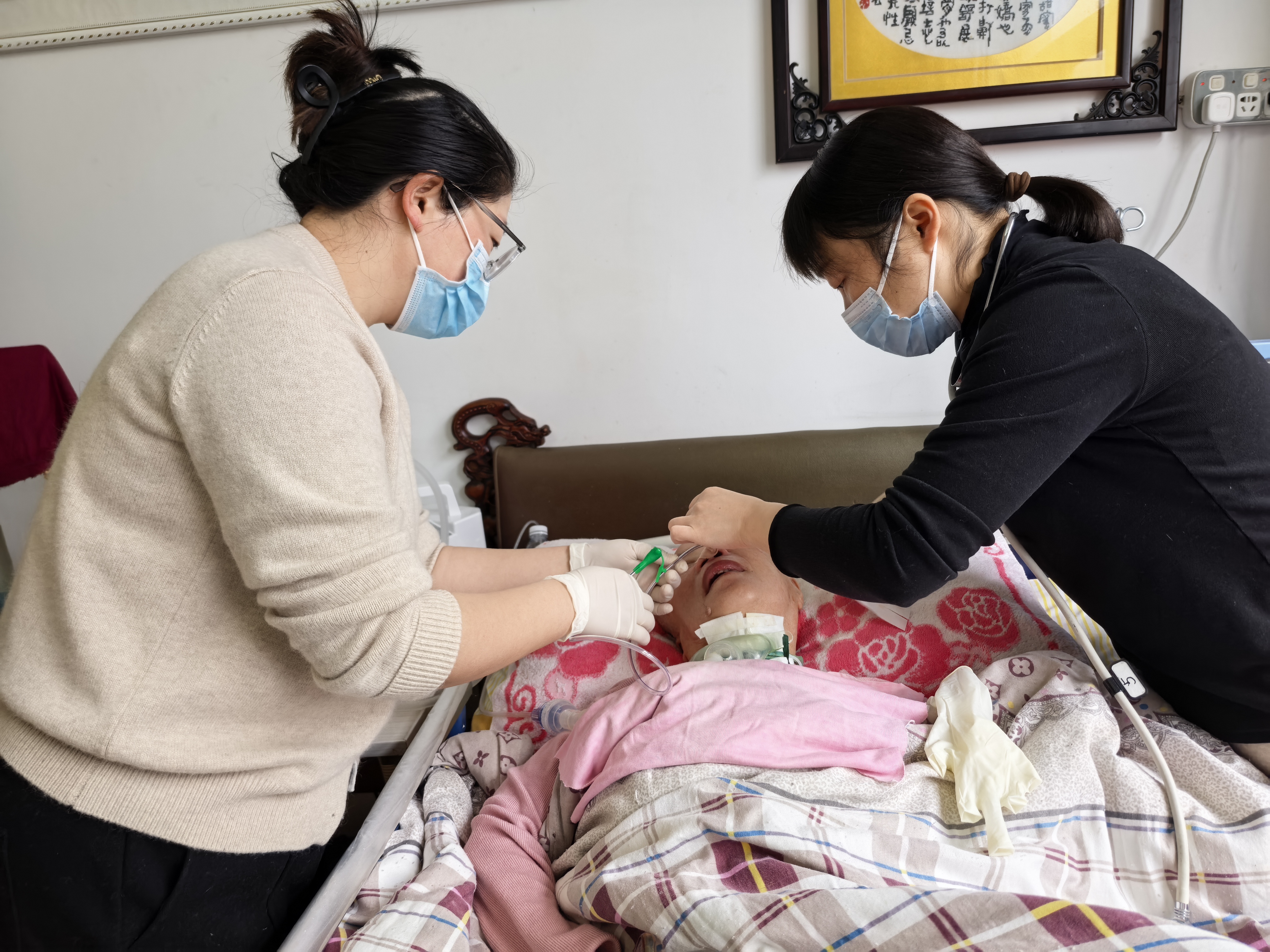 踏入于阿姨家门,她们立刻开启专业模式。先是细致评估患者身体状况,从意识的清晰程度、生命体征的起伏,到皮肤状态的细微观察,每一步都严谨专业。紧接着,凭借精湛技艺,稳稳为患者更换胃管,动作轻柔又利落,新胃管的置入,重连起患者的营养通道。