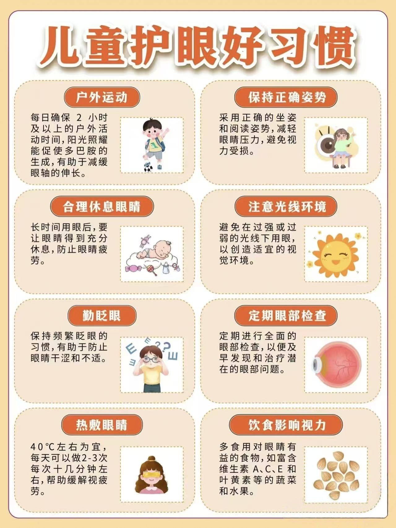 在保障青少年户外活动时间方面,建议每日确保孩子有2小时的户外活动,让眼睛充分接触自然光线;在用眼环境优化上,学校应保证教室照明达标,定期轮换学生座位,为孩子们打造视力友好空间,同时家庭也要使用合适的光源。在饮食方面,倡导科学饮食,每日食用1把深绿色蔬菜、1份橙色蔬果和1掌心坚果,通过合理膳食为眼睛补充营养。