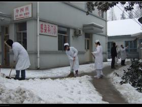 连日的大雪将整座医院装扮的银妆素裹,雪中的院门诊楼分外壮观。然而大雪也给来院就诊的患者和门诊广场周边的居民出行带来不便,全院广大党、团员、干部职工纷纷自发的拿起铁锹、扫帚冒着风雪环医院周