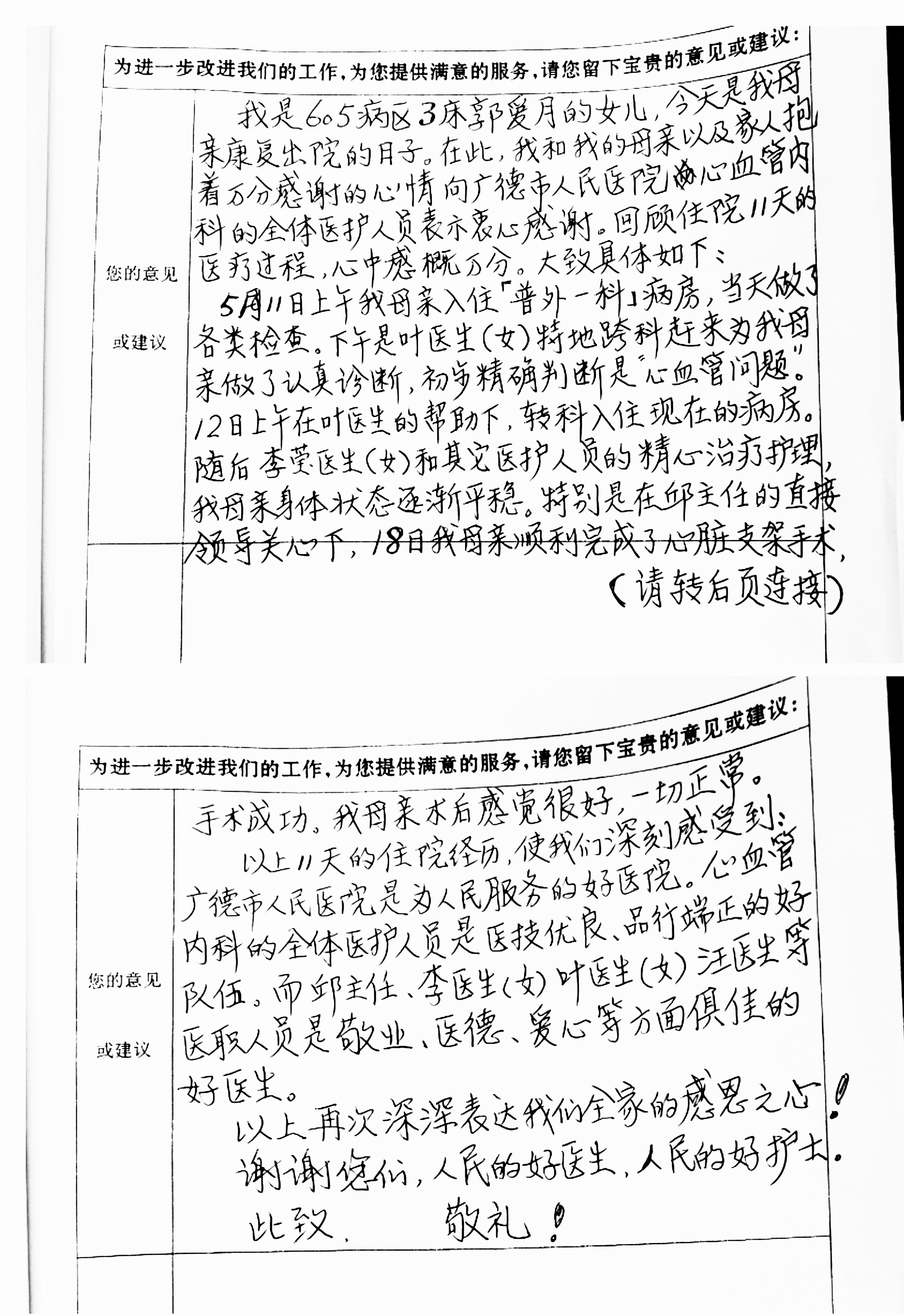临别前汪女士表示,“作为子女,常年工作生活在国外,年迈的父母是我最大的牵挂。父母都是年逾七旬的老人,这次回国也感受到家乡医护人员精湛的专业技术及无微不至的护理服务,感悟到我们的家乡医疗快速发生及变化,作为一位广德人,由衷的自豪”。