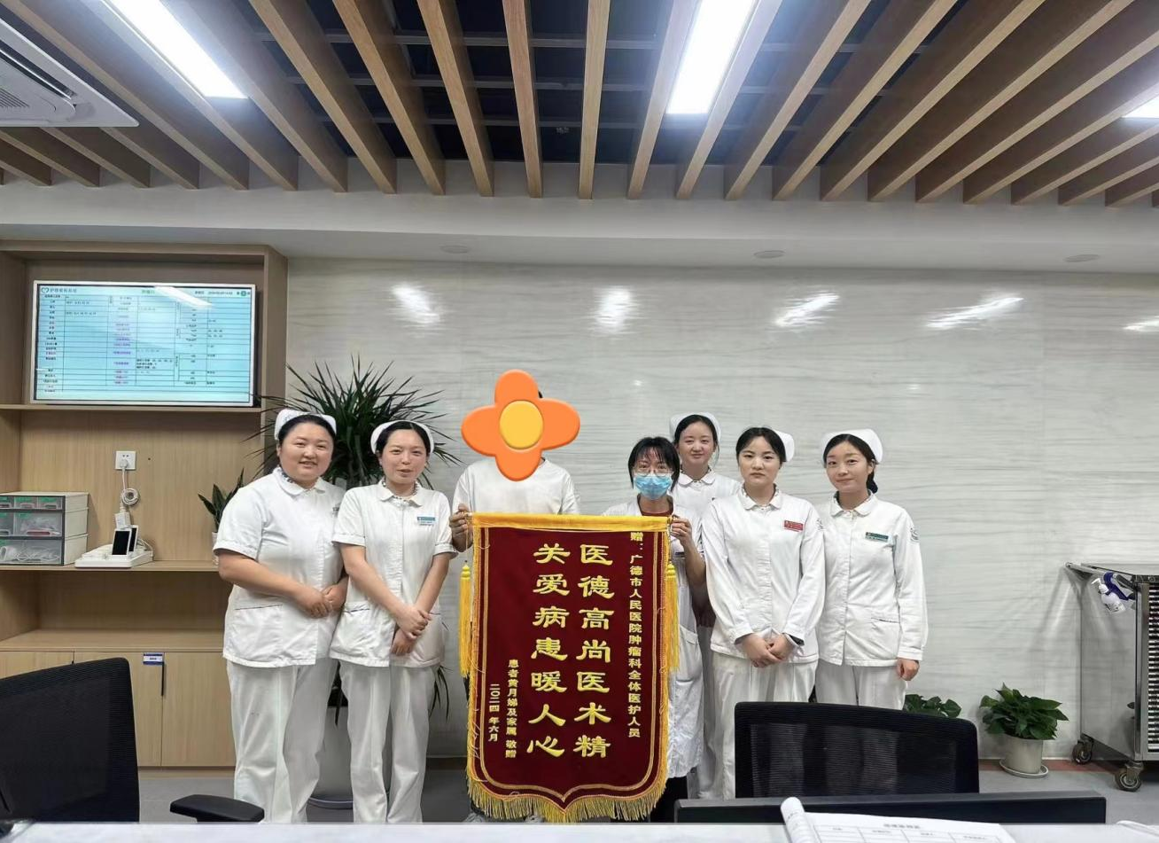 锦旗是一份感谢,更是一份责任。但愿世间人无病,何妨架上药生尘!抗癌路上有苦有泪,对医患双方都充满挑战,但在肿瘤科医护人员的精湛医术和用心护理下,给了黄阿姨一家极大的信心和支持。“这漫长的多年化疗之路,多亏了肿瘤科医护人员的积极治疗和鼓励,给了我们全家希望和信念,让我们有了坚持下去的勇气,太谢谢你们啦!”黄阿姨家属感恩不已,这才有了送锦旗这一幕温暖的画面。是肯定、更是激励。在今后的工作中,肿瘤科全体医护人员将继续努力、精益求精,以更加专业的诊疗技术和更加人性化的服务理念,全心全意守护患者。
