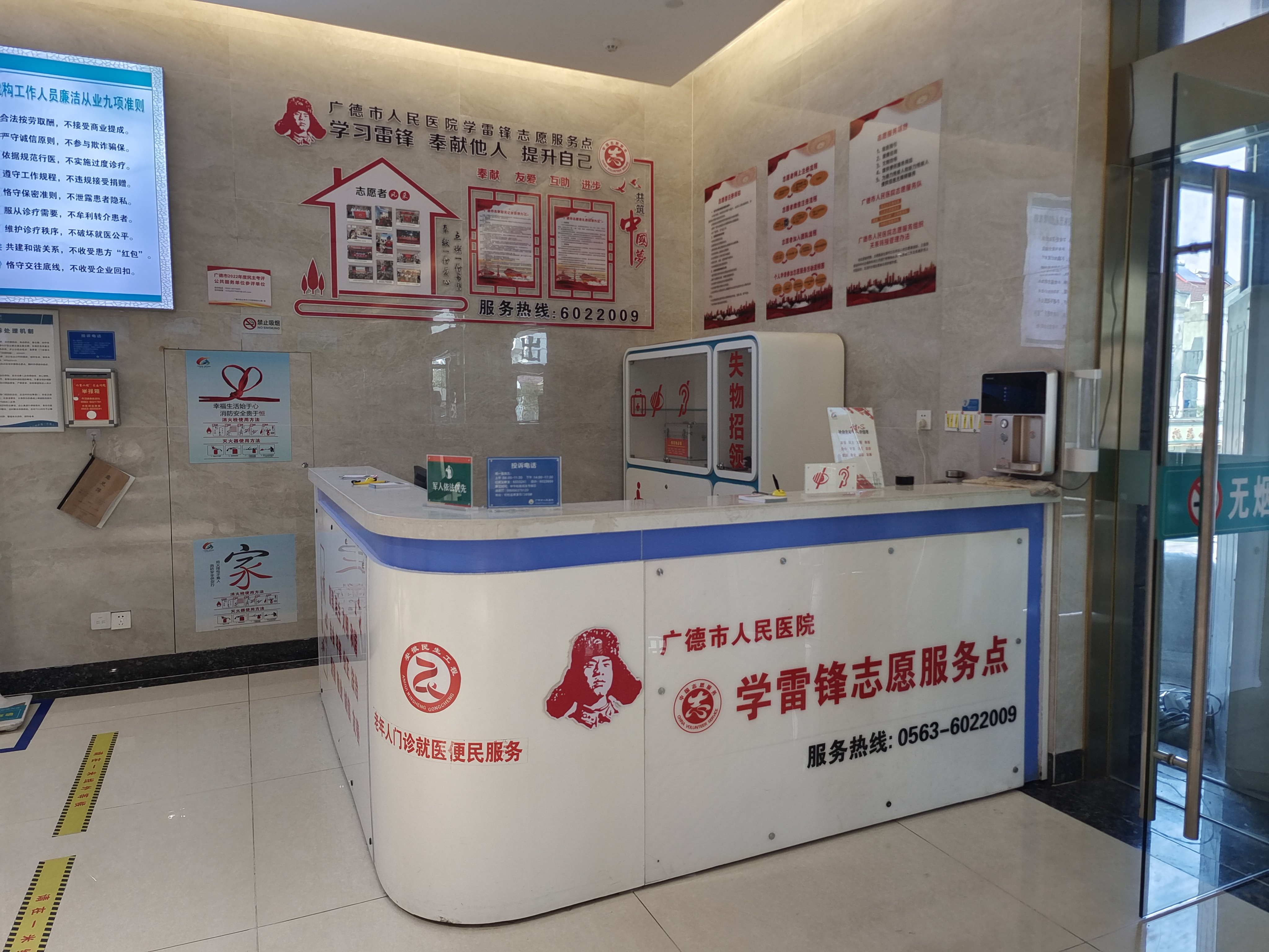 1、学雷锋志愿者点(门诊入口处):6022009 就医指引、健康咨询、提供便民服务设施。