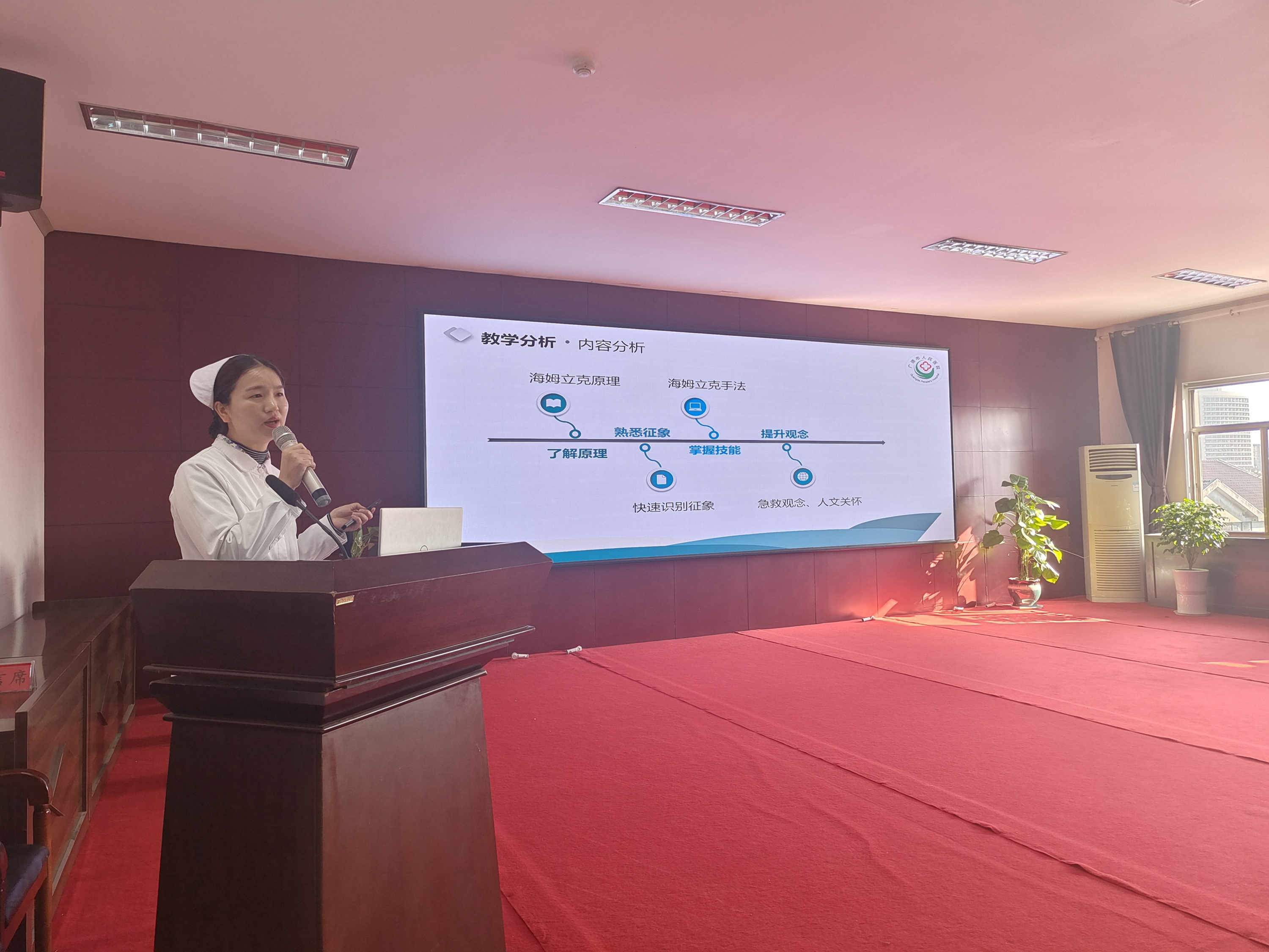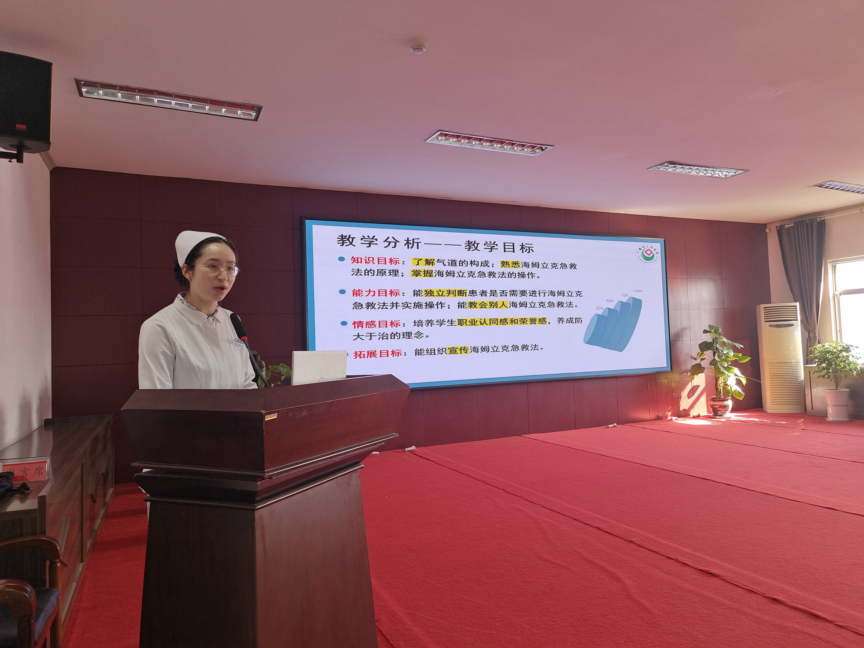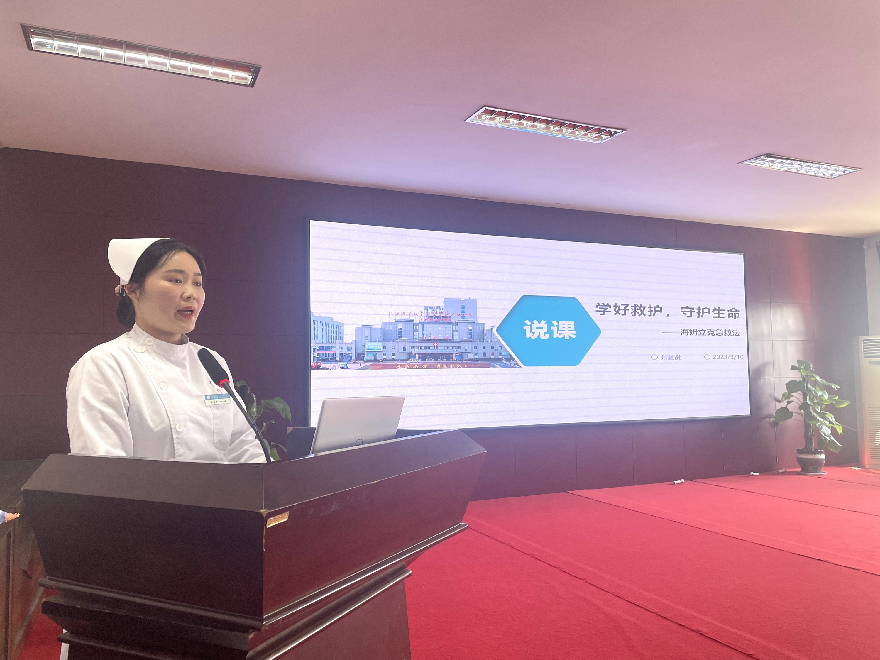 “说课”就是授课老师口头表述具体课题的教学设想及理论依据,也就是授课老师在备课的基础上,讲述自己的教学设计,然后由听者评说,达到互相交流,共同提高目的的一种教学研究和师资培训的活动。“海姆立克急救法”被称为“生命的拥抱”,曾拯救过无数人的生命。我院本次的说课内容为《海姆立克急救法》。